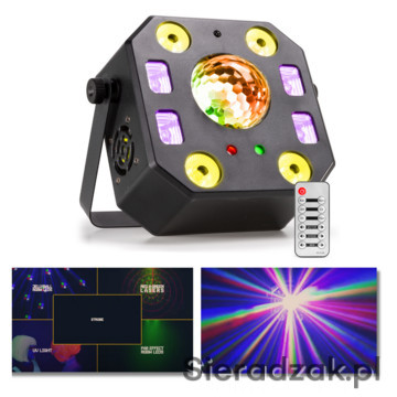 Połączenie 5-efektów w jednej obudowie Led Par + disco kula + lasery + stroboskop + UV ultrafioletet. Dzięki temu posiada duże możliwości pracy w każdych warunkach. Każdy użytkownik będzie z pewnością zadowolony mając możliwość użycia wszystkich efektów na każdej imprezie. Doskonale sprawdza się jako oświetlenie sceniczne w domach i ośrodkach kultury, podczas koncertów, różnego typu występów, gali i prezentacji, a także w klubach tanecznych, dyskotekach oraz jako oświetlenie dla mobilnych DJ-ów, zespołów i firm eventowych itp.