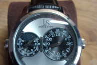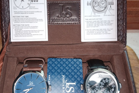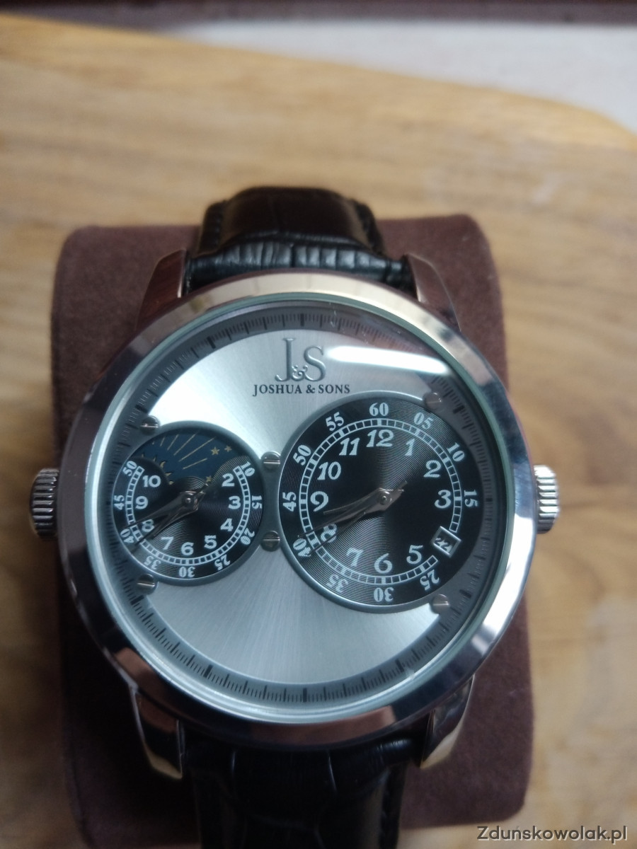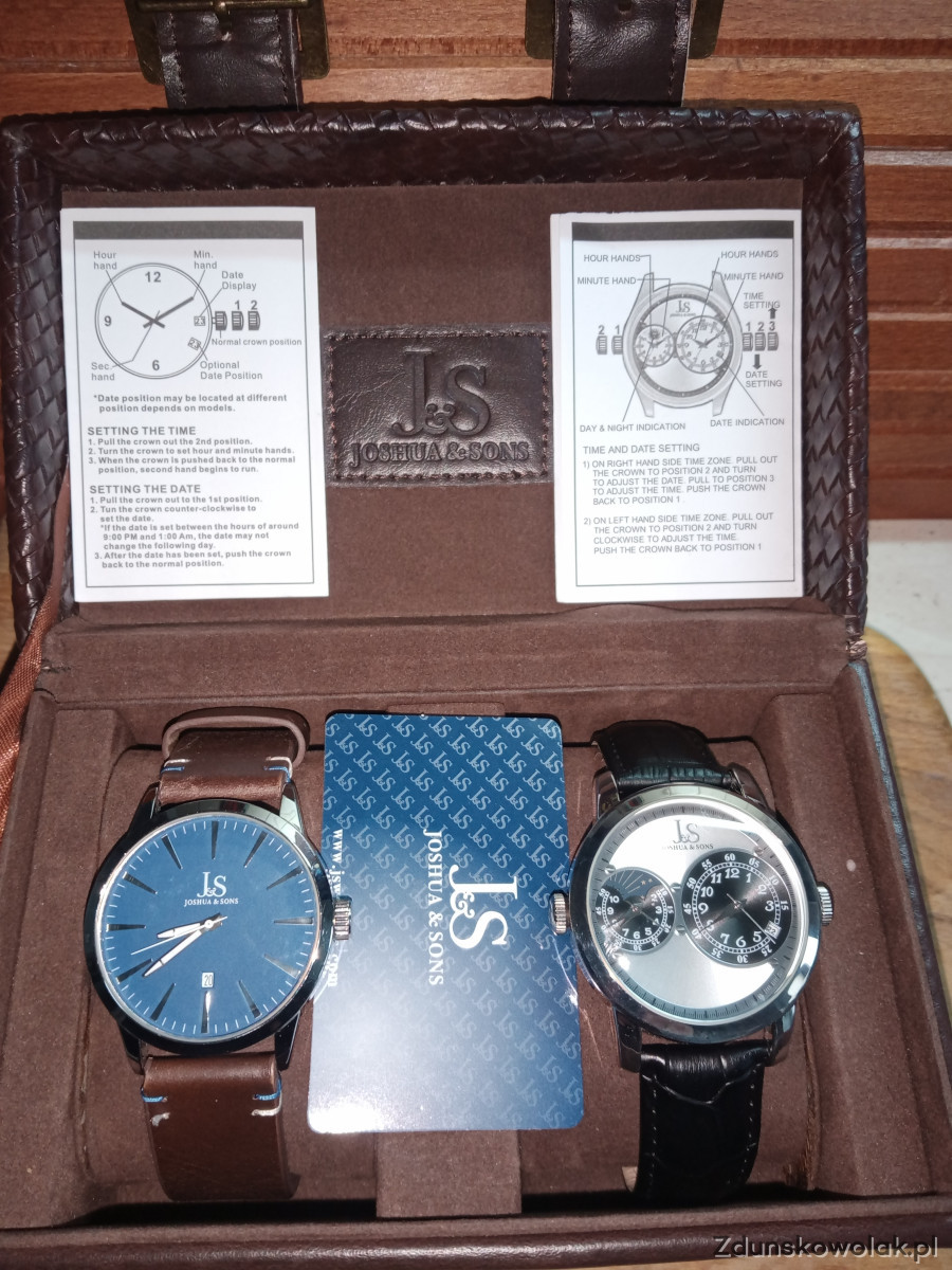 Ciekawy kpl zegarków producenta z Bostonu Joshua &Sons Zawiera dwie sztuki model JS86SSB oraz JS87SS . Pierwszy klasyczny kwarcowy z granatową kopertą.drugi z podwójnym zegarkiem również kwarcowy. Stan bardzo dobry.Cena do rozsądnej negocjacji.