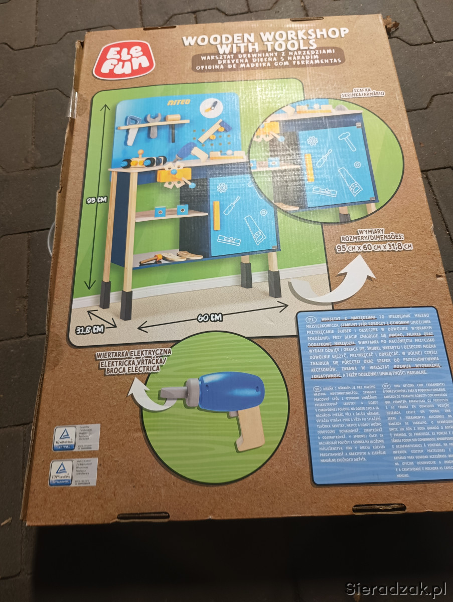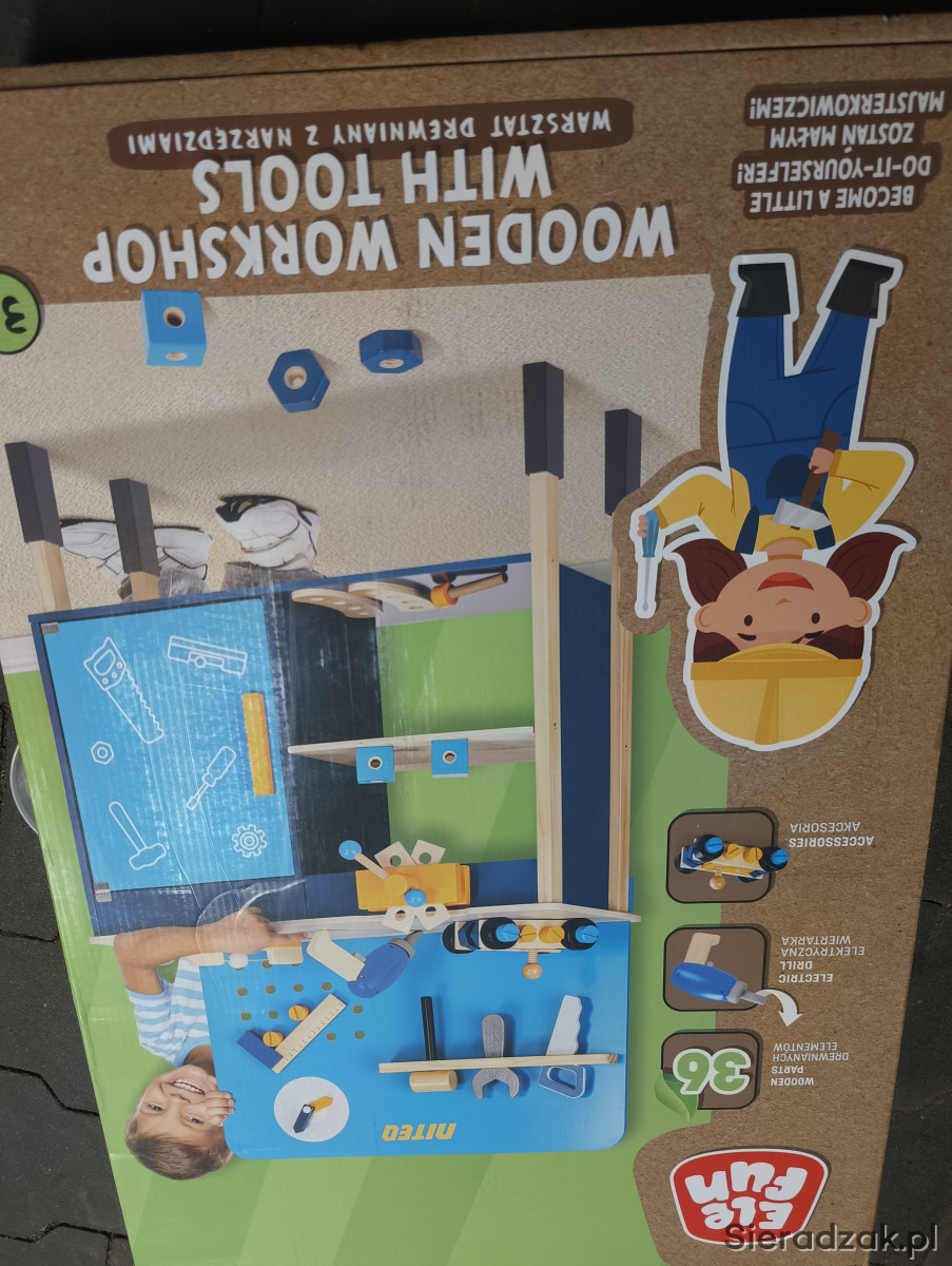 Duży drewniany warsztat dla dzieci z akcesoriami. Stan nowy: zdublowany prezent