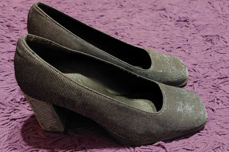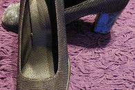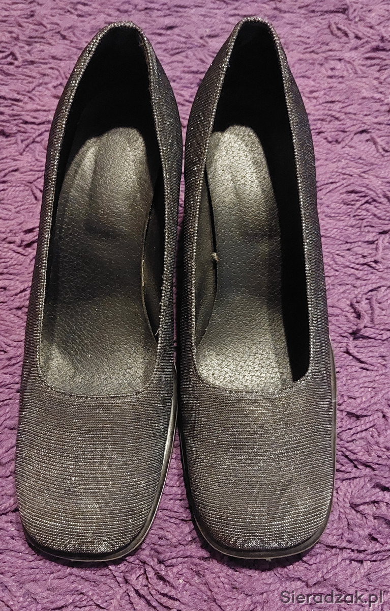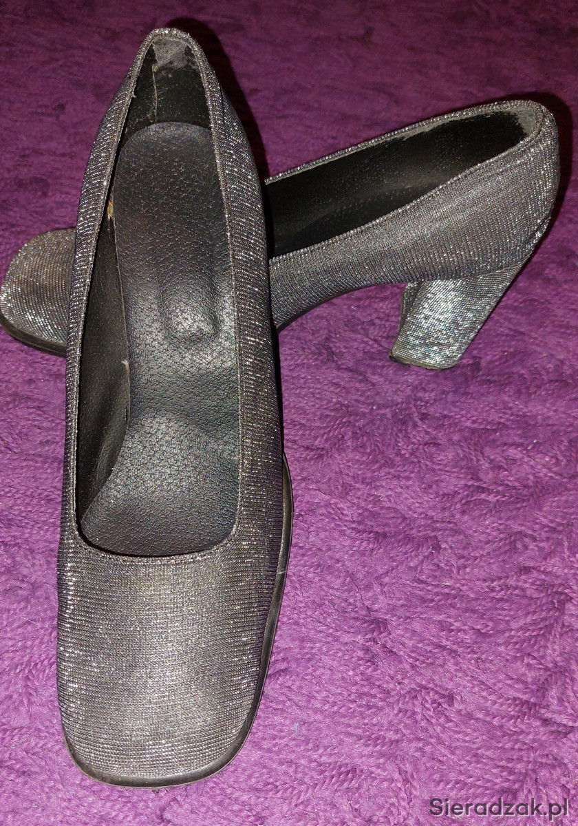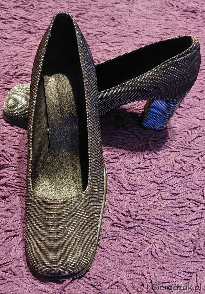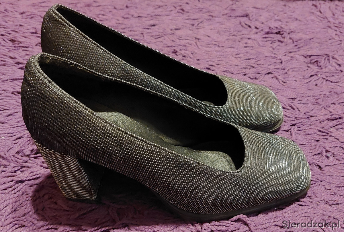 Buty czółenka idealne na imprezę, karnawał lub inną okazję. Rozmiar 38. Obcas typu słupek, wysokość ok. 7,5cm. Kolor srebrny, mieniące się - brokat. Używane bardzo sporadycznie, okazjonalnie. Nie są zniszczone. Fleki posiadają minimalne ślady użytkowania.