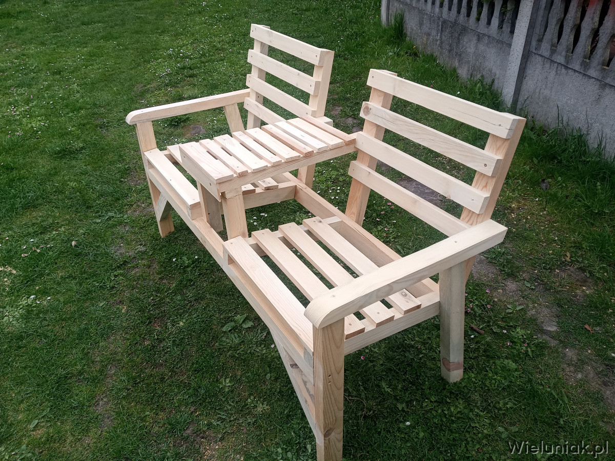 Sprzedam wygodną ławkę 2-osobową ze stolikiem kawowym. Ławka wykonana z drewna sosnowego w stanie surowym ,
