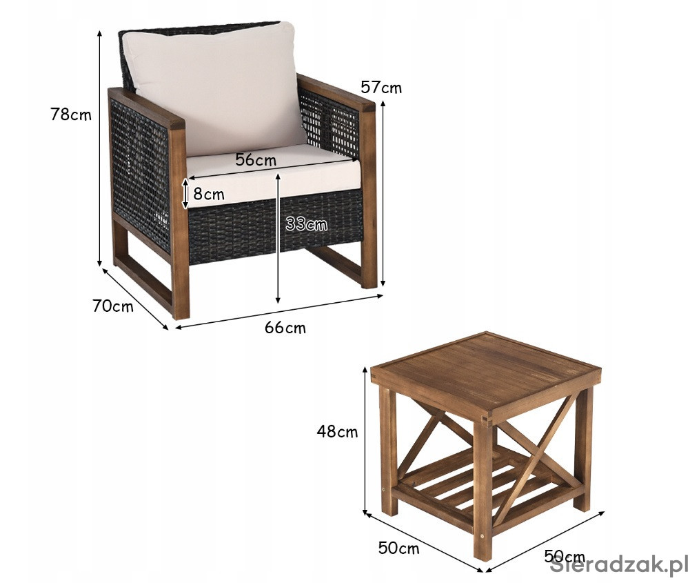 Łatwy montaż i konserwacja: ten zestaw mebli zawiera jasne instrukcje i wszystkie niezbędne akcesoria ułatwiające montaż. Wymiary każdego krzesła to 66 x 71 x 78 cm (dł. x szer. x wys.), natomiast wymiary stołu to 50 x 50 x 48 cm (dł. x szer. x wys.). Wymiary poduszek to 57 x 57 x 8 cm (dł. x szer. x wys.). A wodoodporne materiały zapewniają łatwe czyszczenie
