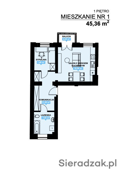 Dwa pokoje, przedpokoj, aneks kuchenny.