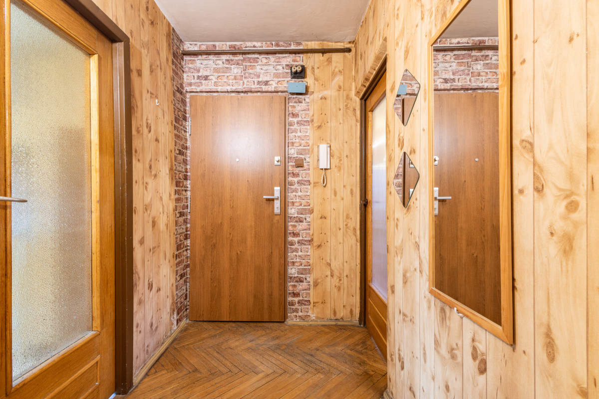 Korytarz w literę L będzie idealnym miejscem na obrazy, wieszaki lub zdjęcia. Zabudowana w tej przestrzeni szafa pomieści nie tylko okrycia wierzchnie.