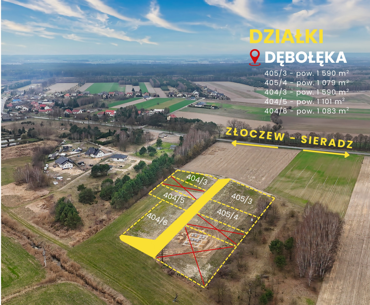 Działka kształtem zbliżona do prostokąta, oznaczona nr 404/3 położona w malowniczej części Dębołęki w sąsiedztwie Żegliny, zaledwie kilka minut drogi od Sieradza.