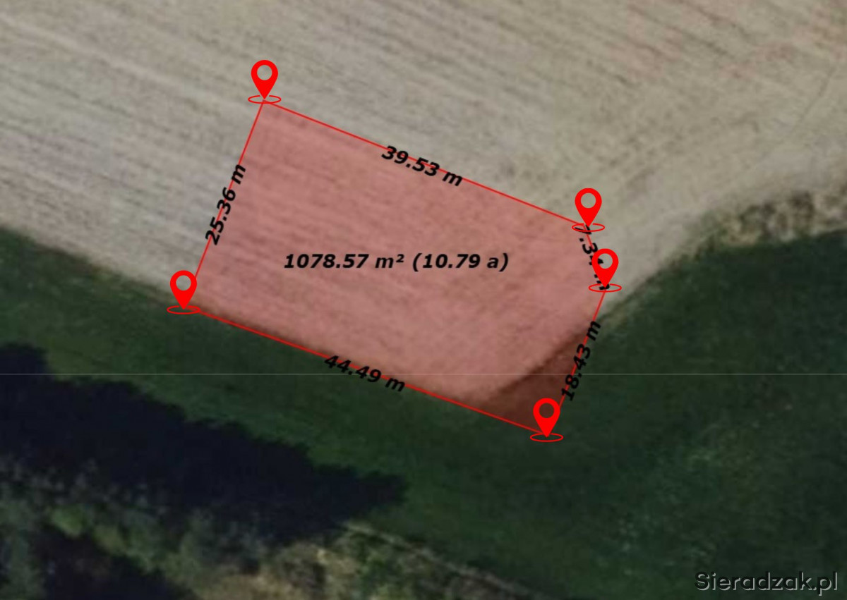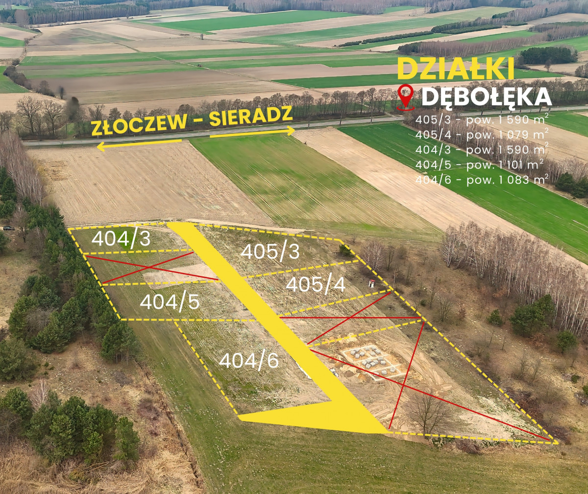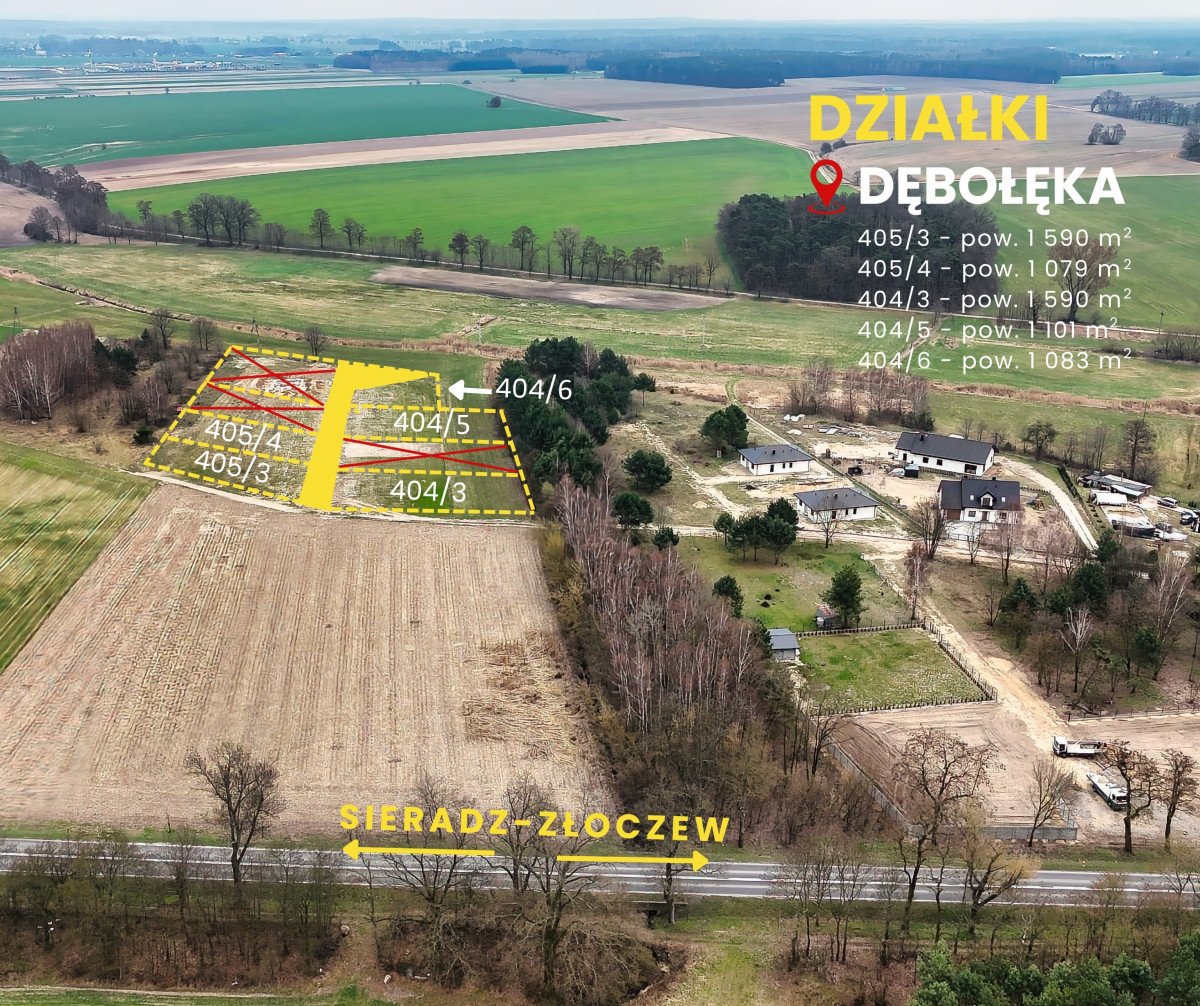 Działka w kształcie prostokąta, oznaczona nr 404/6 położona w malowniczej części Dębołęki w sąsiedztwie Żegliny, zaledwie kilka minut drogi od Sieradza.