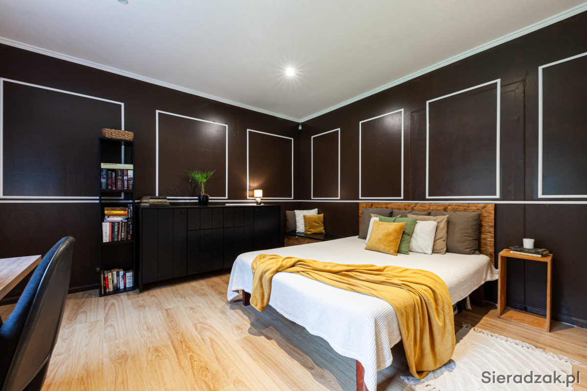 Na lewo od wejścia mieści się piękna, klimatyczna sypialnia (17,30 mkw) z dużym łóżkiem i oknem z widokiem na uspokajającą zieleń.