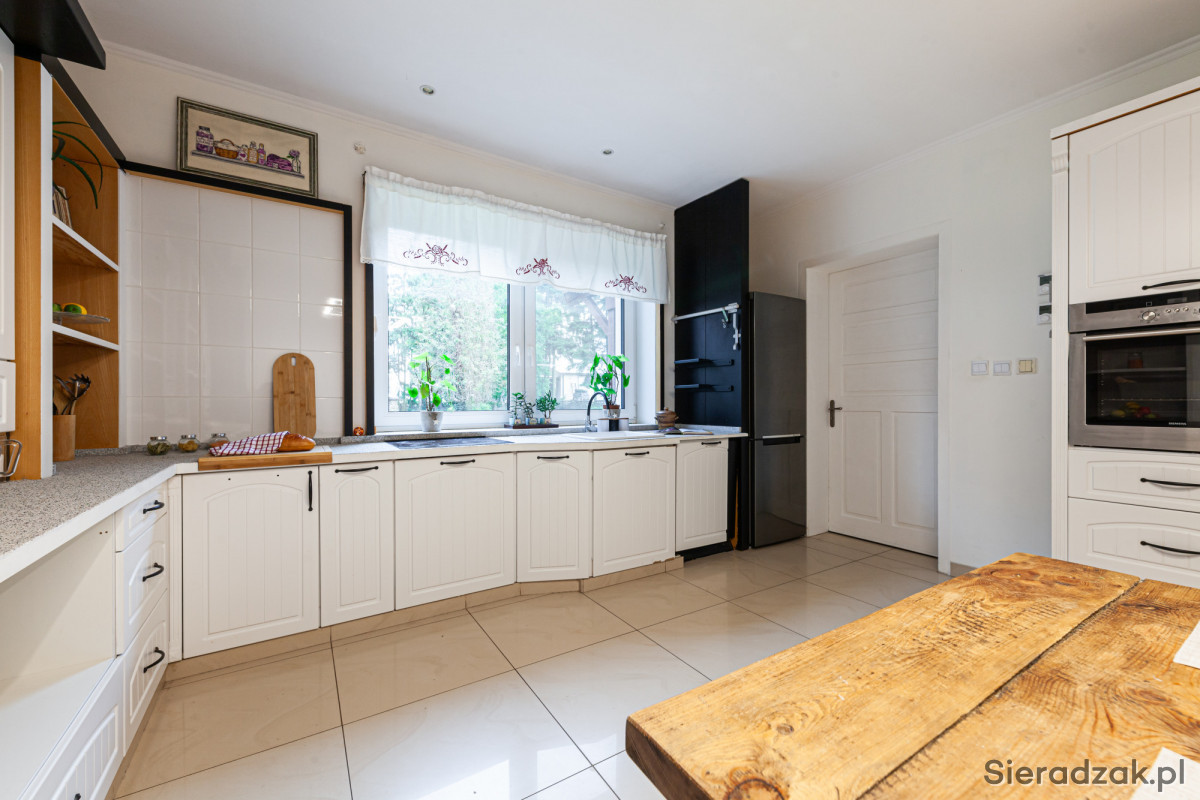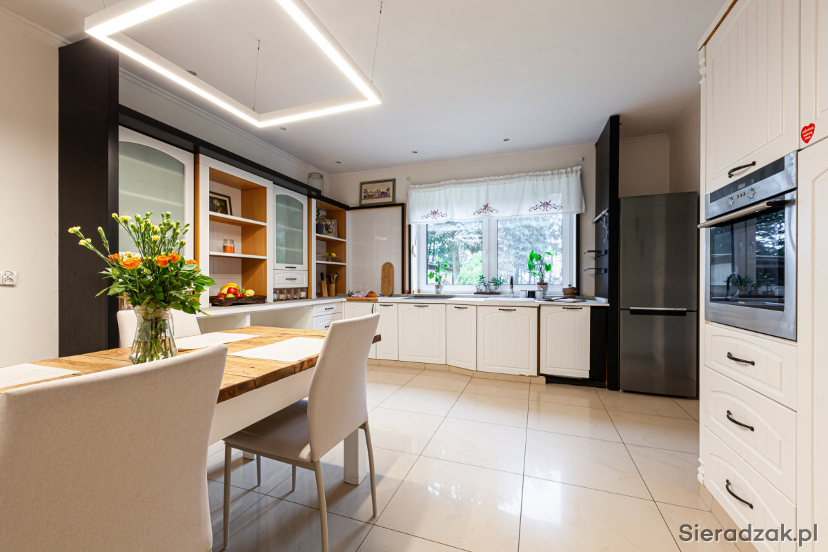 Przedsionek prowadzi do dużej, stylowej kuchni (18,40 mkw), która jest sercem tej posiadłości. Białe szafki rozjaśniają wnętrze, a duże okno oferuje widok na przepiękny ogród. Centralnie umieszczony duży stół idealnie nadaje się na rodzinne posiłki. Jest wyposażona w cały sprzęt AGD.