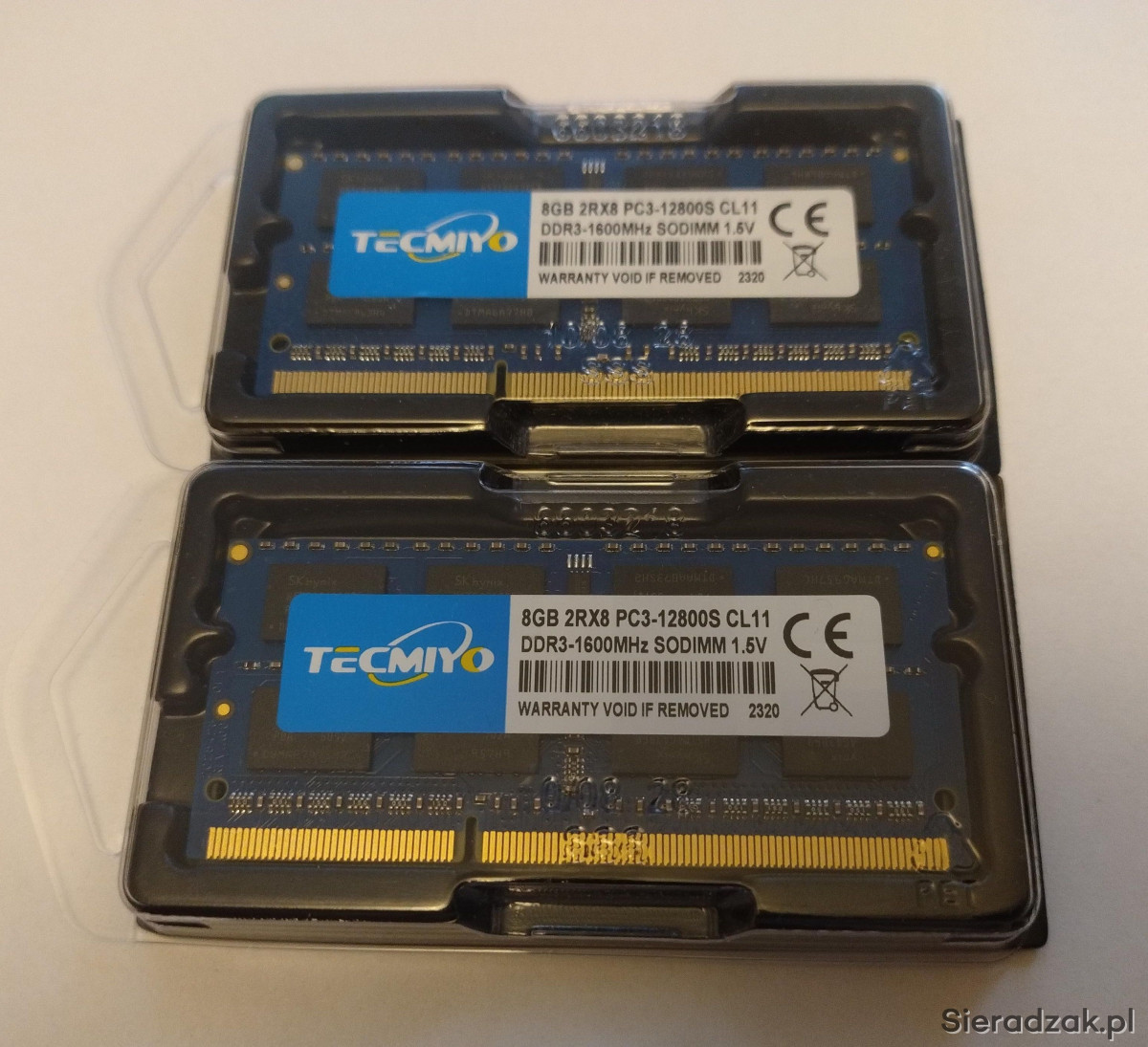 Na sprzedaż posiadam w 100% sprawne pamięci RAM do laptopa firmy Tecmiyo o pojemności 16 GB (2 X 8 GB) DDR3 1600 MHz PC3-12800S 2RX8 SODIMM CL 11, 1,5V Non-ECC, które zbudowane na wysokiej jakości kościach firmy SK Hynix.