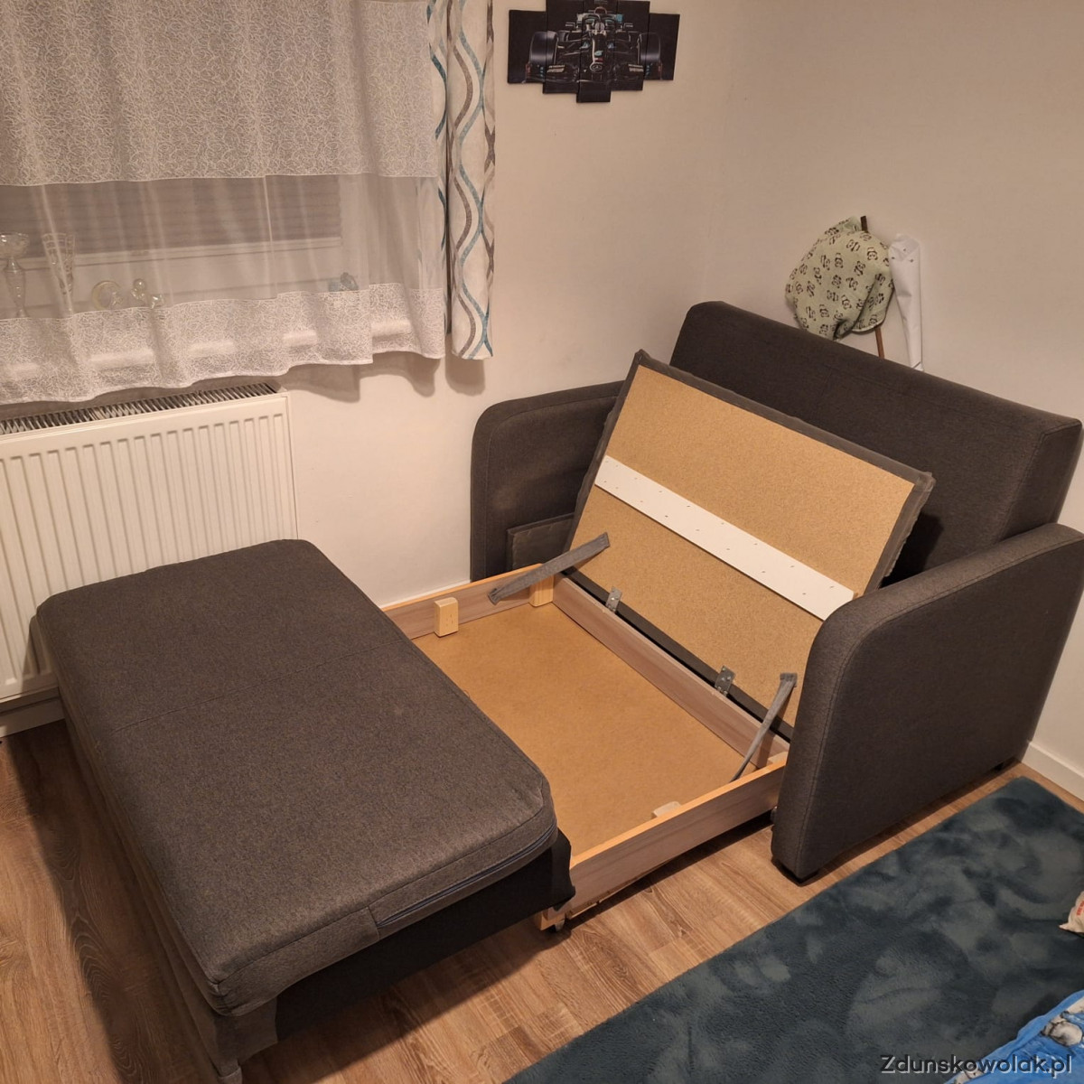 Sprzedam mała rozkładaną kanapę. Powierzchnia spania 100x180cm. Rozmiar złożonej to 80x130cm. Wysokość 85cm. Posiada pojemnik na pościel.