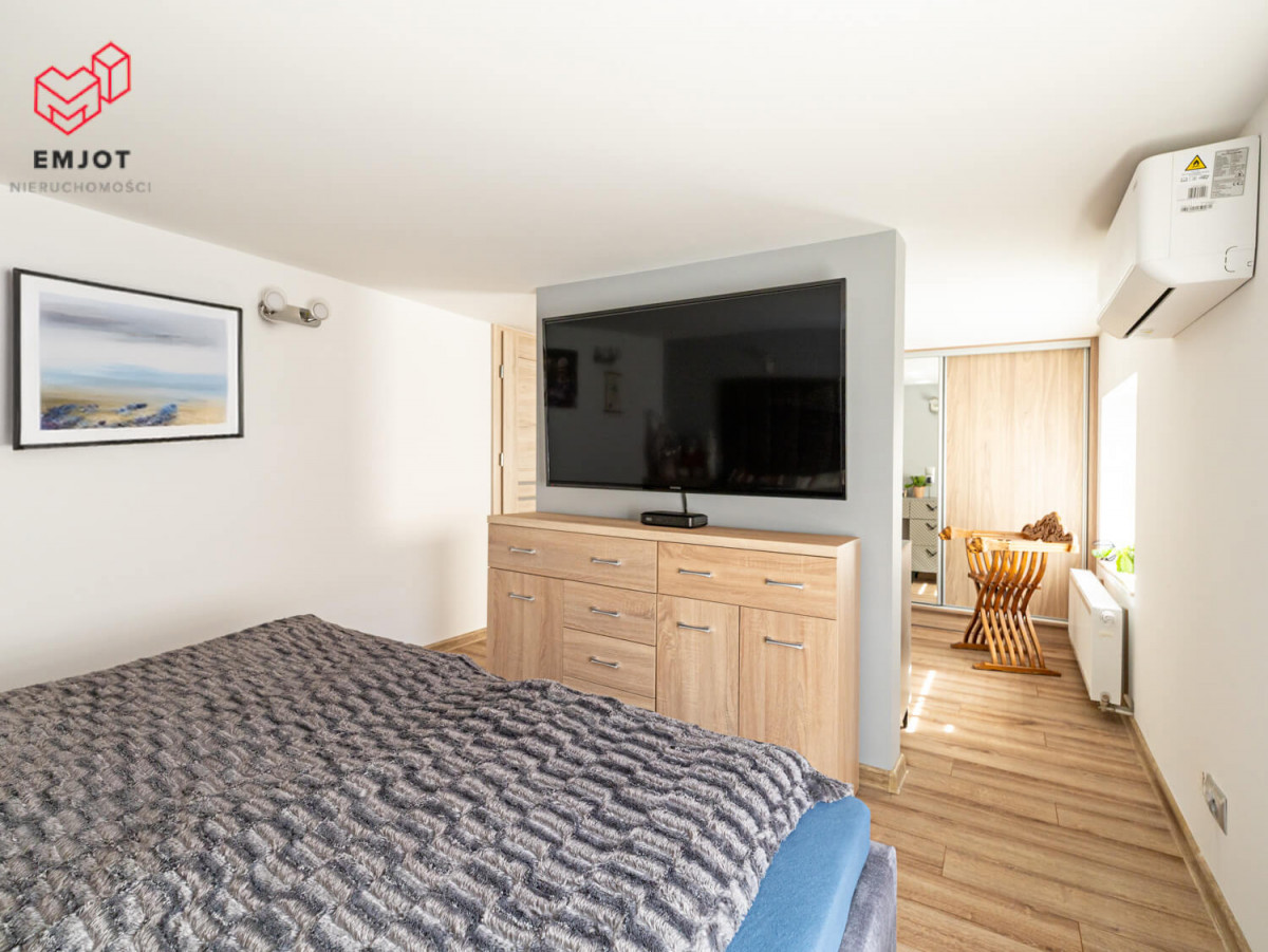 Na półpiętrze znajdziemy dużą sypialnie podzieloną na dwie części (sypialnianą oraz dzienną)