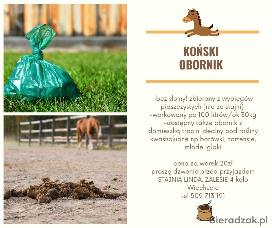 do wyboru obornik czysty pod owoce i warzywa a także obornik zakwaszony trocinami idealny pod chortensje, borówki, wrzosy i inne rosliny kwaśnolubne. Bezpieczny bez kompostowania. Odbiór osobisty na terenie stajni ewentualnie dowiozę minimalnie 6 sztuk na terenie Sieradza z dopłatą 20zł za dowóz.