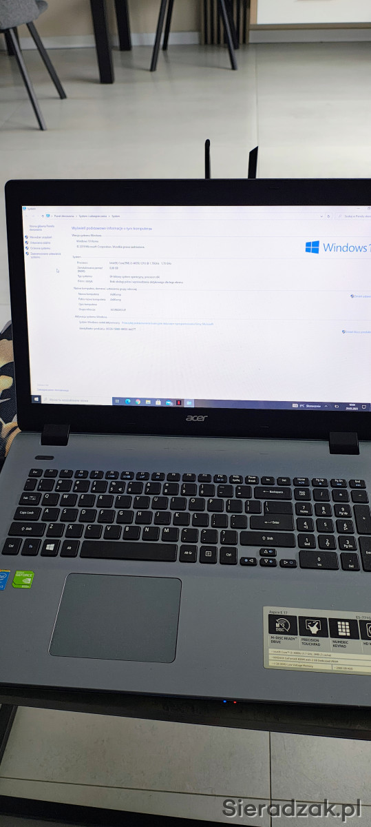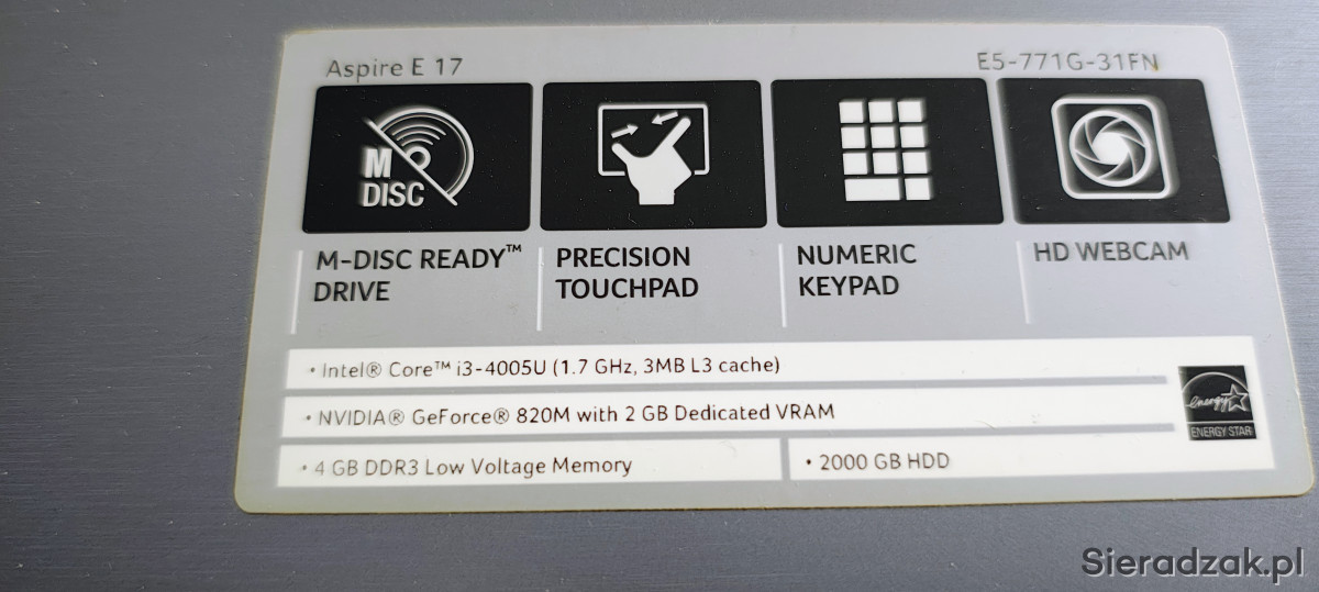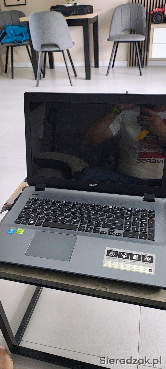 Laptop używany Acer Aspire E17 sprzedaję jako uszkodzony ponieważ ma do wymiany dysk twardy i akumulator ma już mniejszą pojemność. Laptop w zestawie z zasilaczem sprawnym. Dołożona pamięć RAM do 8 GB. Laptop 17 cali