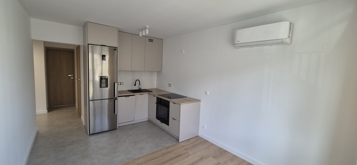 Kuchnia jest w pełni wyposażona (zmywarka, piekarnik, płyta indukcyjna, lodówka z zamrażalnikiem). Kuchnia wygląda estetycznie i nowocześnie. Jest pojemna i funkcjonalna.