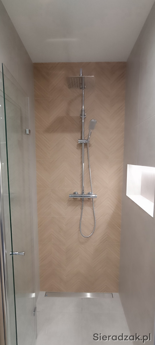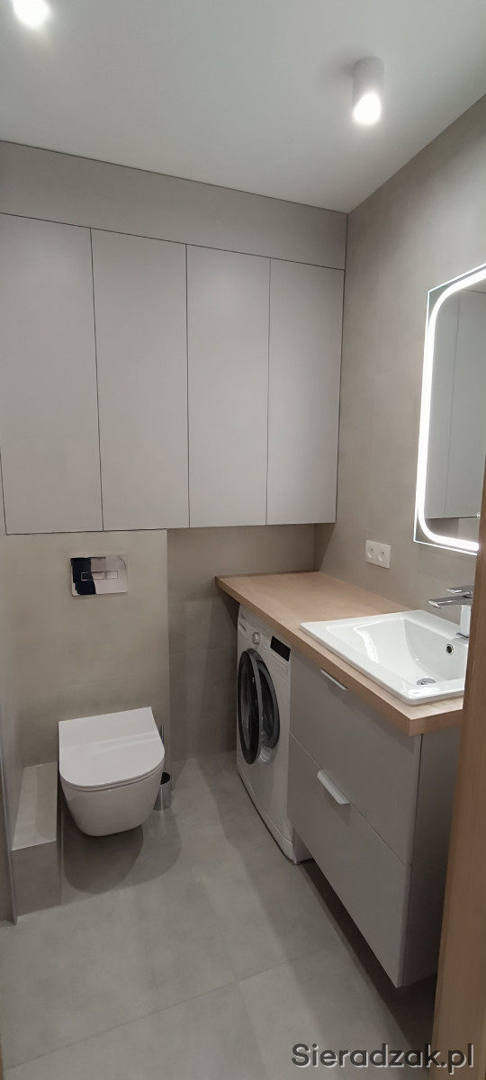 W łazience znajduje się pralka, wygodny i nowoczesny prysznic oraz szafki.