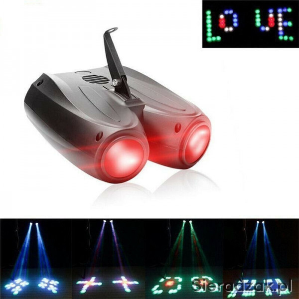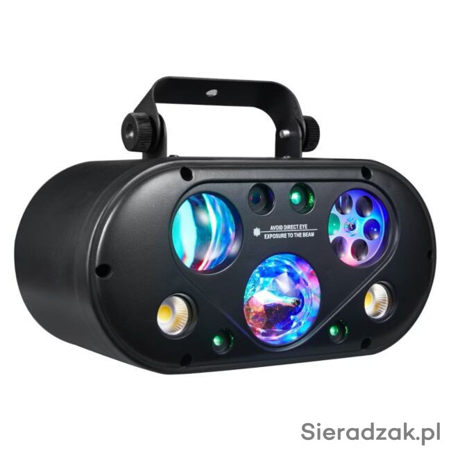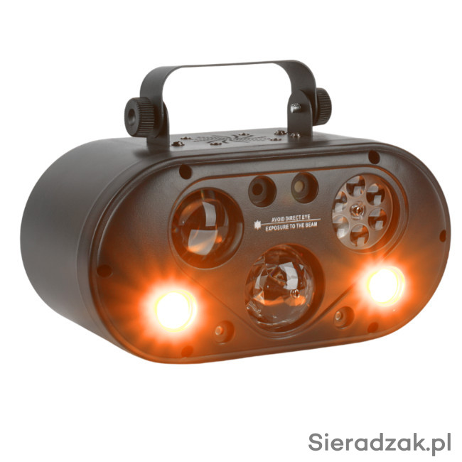 Zestaw zawiera dwa światła od lewej strony efekt połączenie 6-efektów w jednej obudowie Led Par + disco kula + lasery + stroboskop złoty + gobo wzory + water wave (fala wodna).