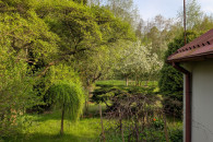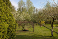 * Nasadzenia: Drzewa owocowe (jabłonie, brzoskwinie, czereśnie), drzewa i krzewy ozdobne.