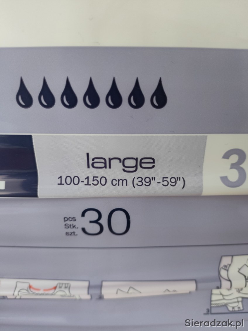 Sprzedam nowe opakowania pampersów dla dorosłych. Rozmiar L. 30 sztuk w paczce. Do sprzedania 7 paczek. Cena za paczkę 25 zł.