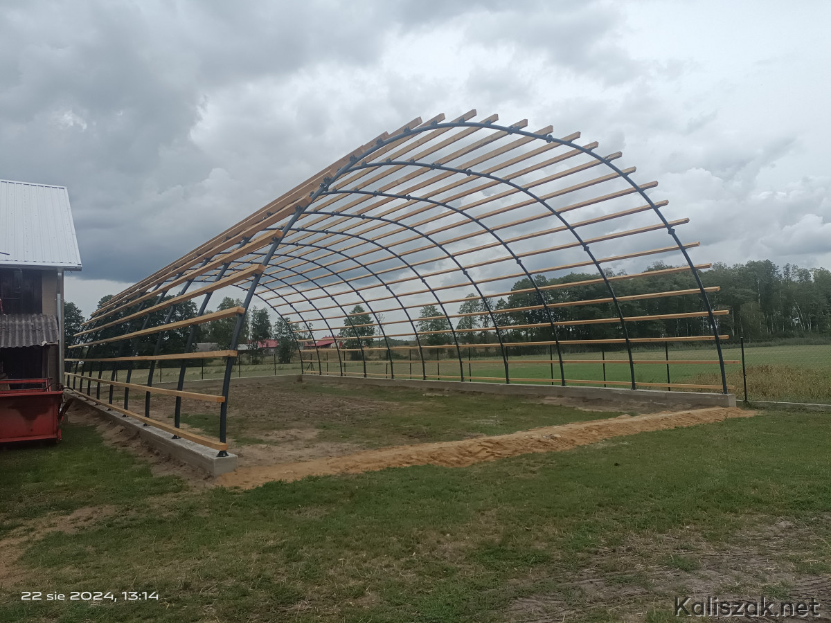 Wykonana z nowej rury 76,1mm scianka 4mm. Pokrycie łaty drewniane 7x10 oraz blacha trapezowa T7.