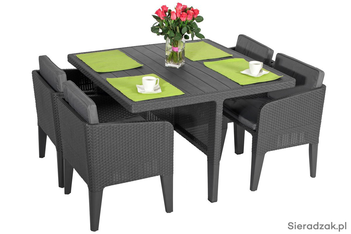 Komplet mebli ogrodowych pięcioczęściowy dla 4-osób na taras, balkon lub patio. Meble z tworzywa sztucznego we wzór rattanowy. Zestaw cztery fotele z poduszkami i stół obiadowy w kolorze grafitowym.