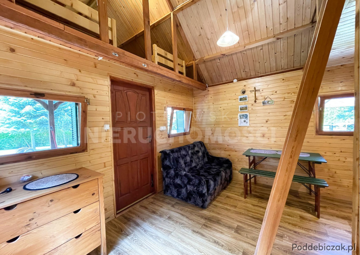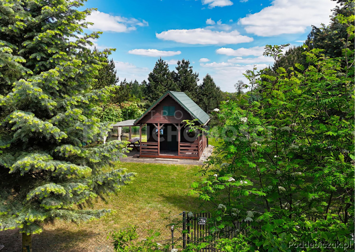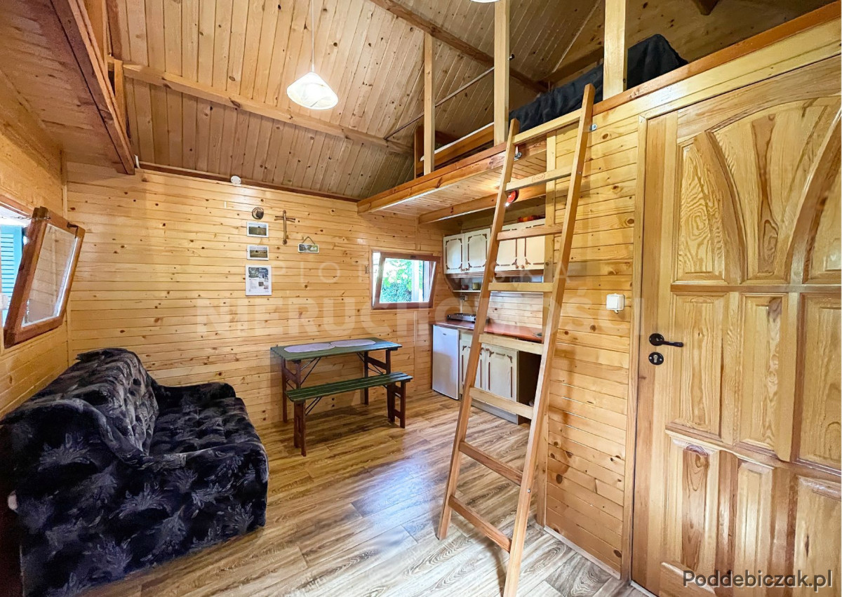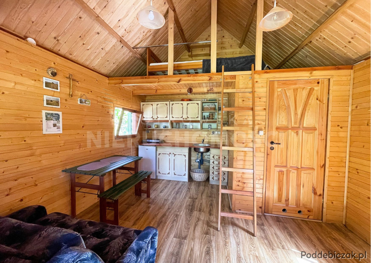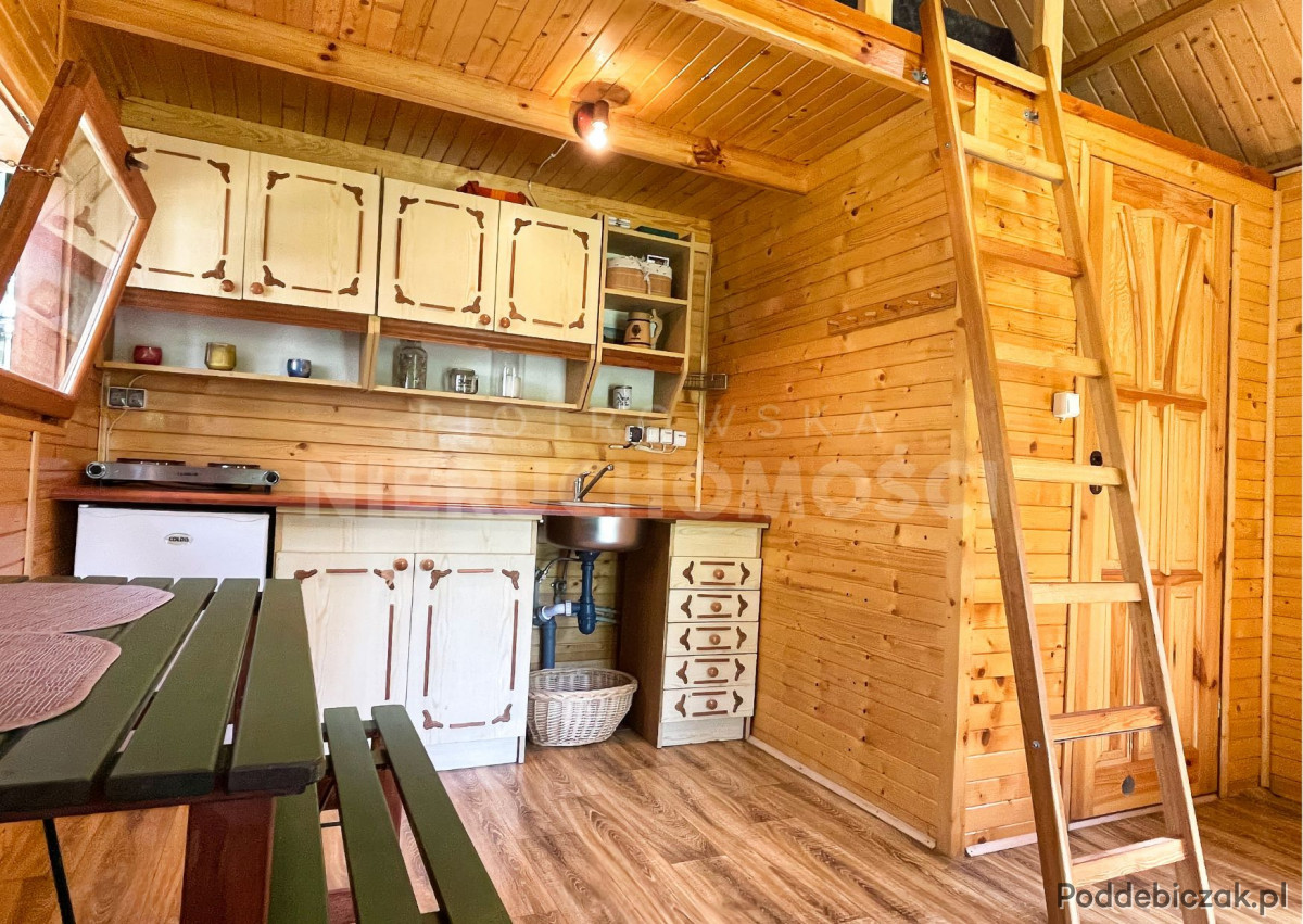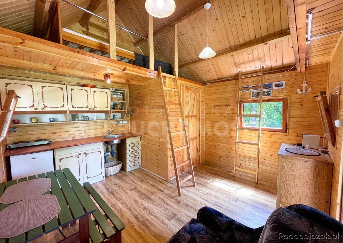 Na działce domek drewniany 4 m x 4 m w skład którego wchodzą: pokój dzienny z aneksem kuchennym, dwie sypialnie na antresoli, łazienka z WC wyposażona w kabinę prysznicową.