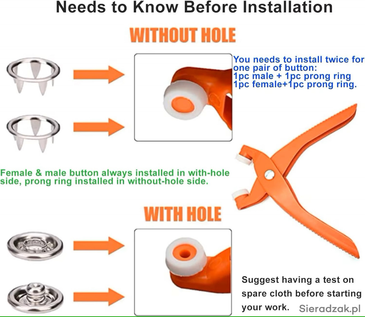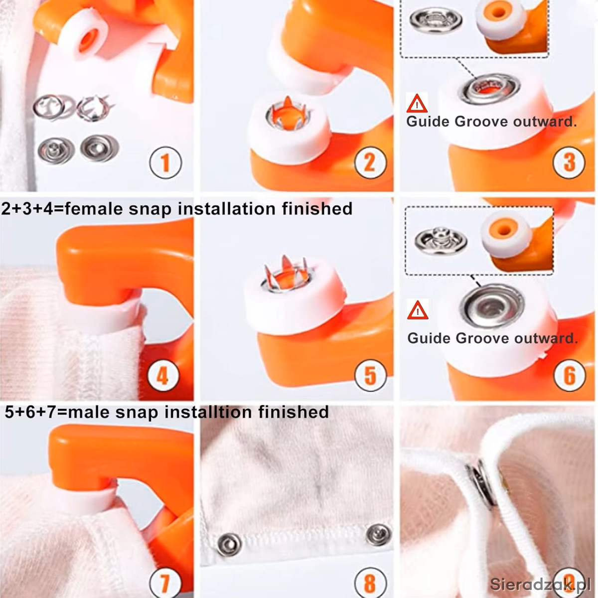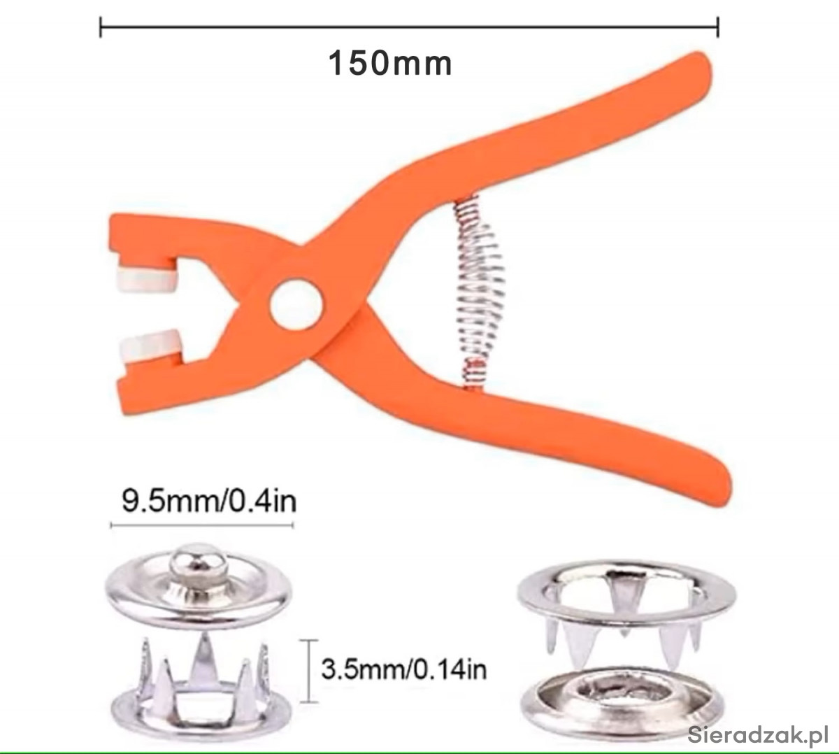 Sprzedam komplet do samodzielnego montażu zatrzasków. W gospodarstwie domowym znajdzie szerokie zastosowanie do ubrań, szczególnie dziecinnych, poszwy na kołdry i podszki, płaszcze przeciwdeszczowe, zasłony, ubranka dla zwierząt itp.