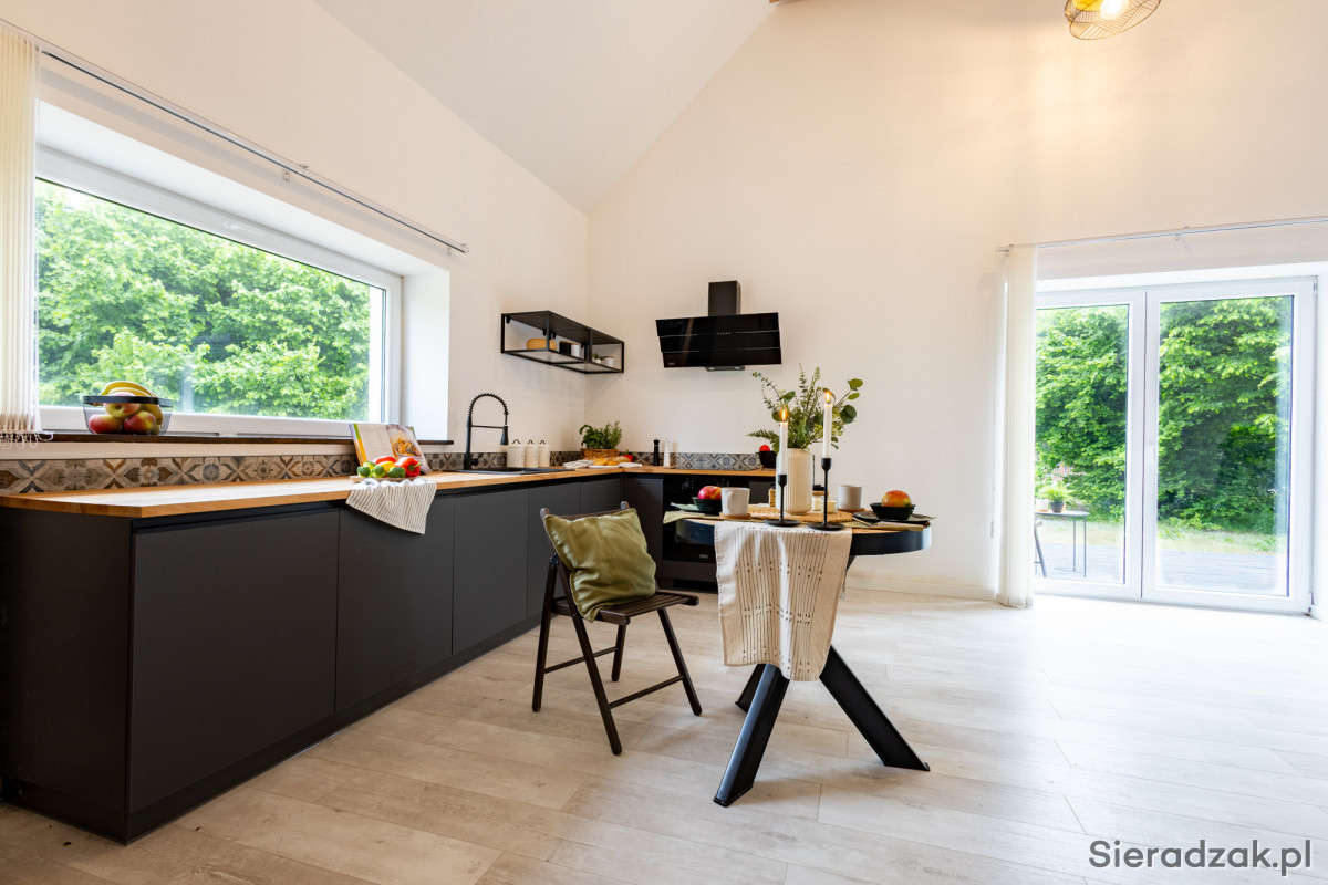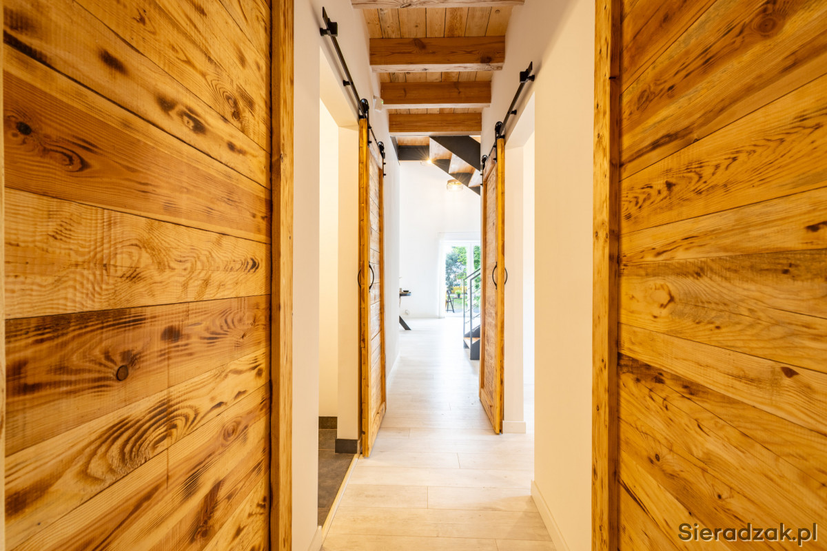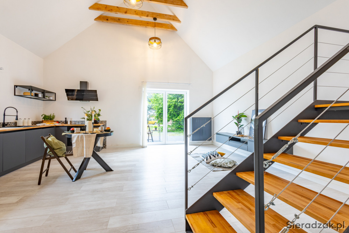 Wnętrze domu jest nowoczesne i dobrze oświetlone. Podłoga z panelami w kolorze jasnego drewna, przesuwne rustykalne drzwi w połączeniu nadają ciepła i charakteru. Podział na strefę dzienną i prywatną ułatwia organizację życia domowego. Wspólne połączenie salonu, jadalni i kuchni wprowadza wrażenie spójności i przestrzeni. Okna tarasowe skierowane są w na południowy-zachód, pozostałe na południowy-wschód oraz północny-zachód. Oddzielne 3 pokoje umożliwiają stworzenie sypialni z miejscem na garderobę, gabinetu oraz pokoju dla dzieci.
