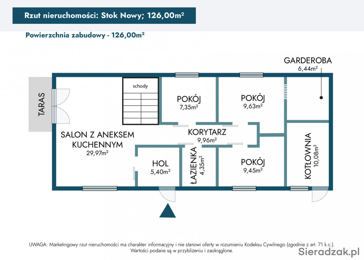Budynek i jego wnętrze zachwyca swoją prostotą i przemyślanym rozkładem pomieszczeń. Powierzchnia zabudowy domu to 126 m² i ocieplony styropianem 10 cm. Dach dwuspadowy pokryty blachodachówką i ocieplony pianką PUR. Posiada drewniany strop. Zostały zamontowane okna PCV, które łączy doskonała funkcjonalność z niepowtarzalnym designem.