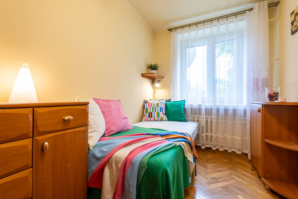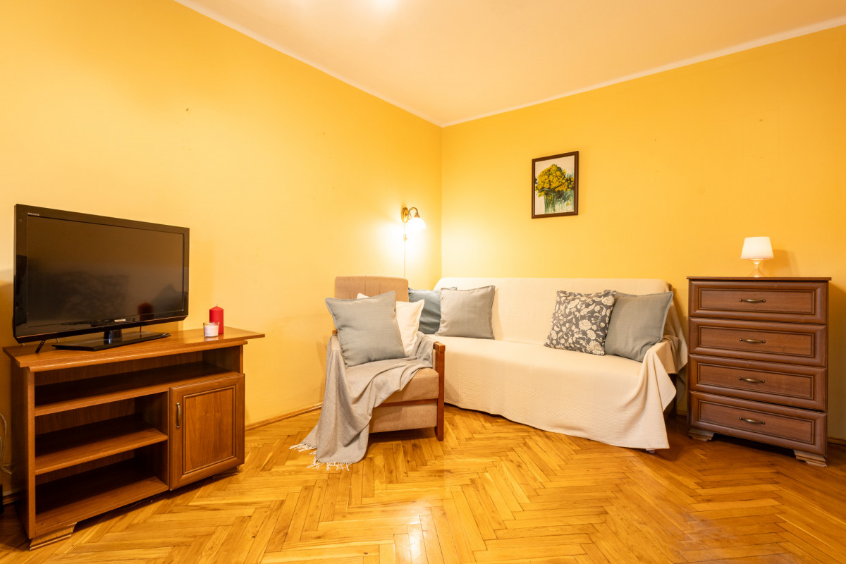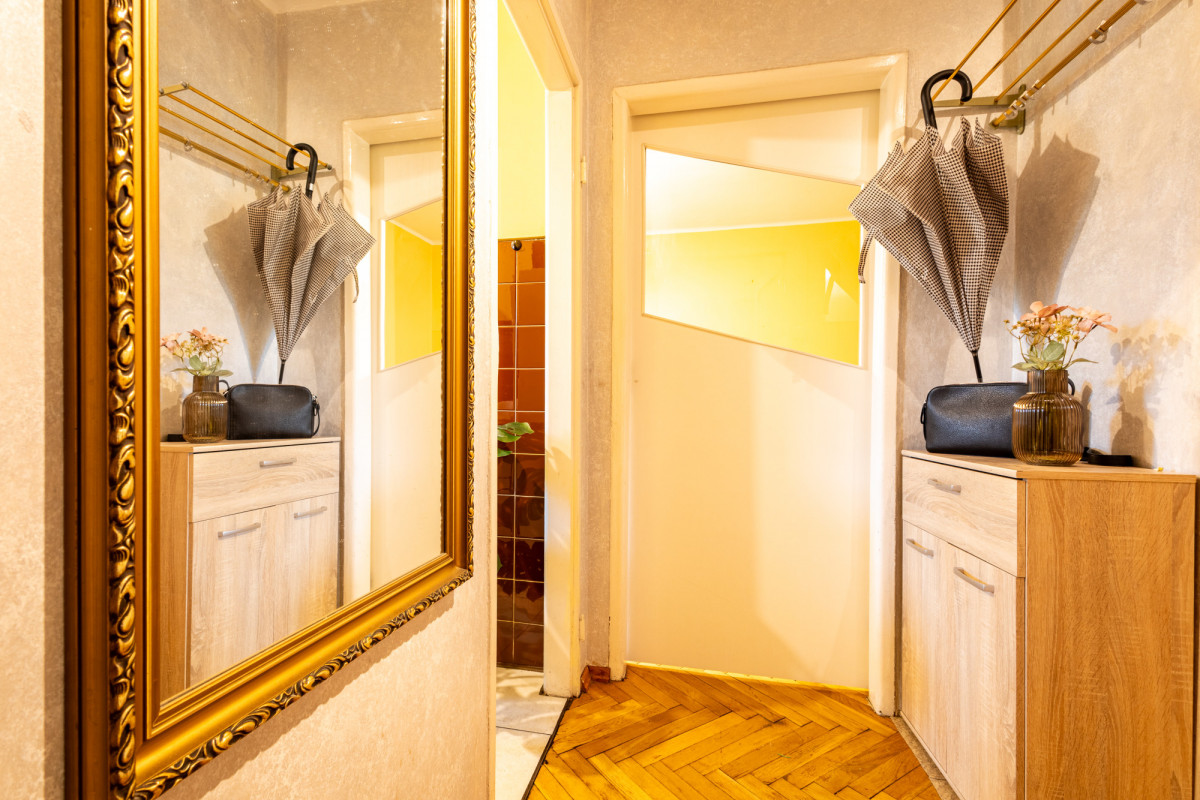 Okna wychodzą na jedną stronę świata, co zapewnia spójne doświetlenie pomieszczeń i ogranicza wpływ hałasu z ulicy. Układ mieszkania jest funkcjonalny i ustawny.