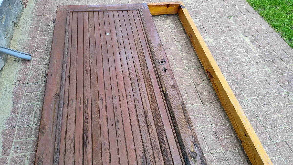 Skrzydło - wymiary zewn: 199 x 95,5 cm. grubość: 4 cm, zachodzi na próg 3,5 cm.