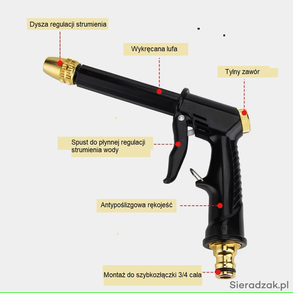 Pistolet idealnie sprawdzi się w domowym codziennym użytkowaniu do mycia pojazdów, podlewania działki, lub kota sąsiada.