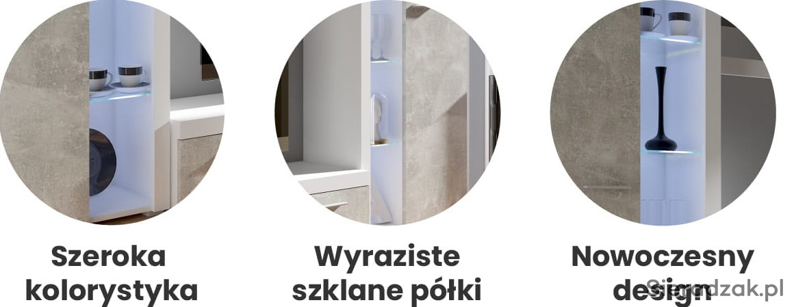 Kompozycja Rumba XL jest ponadczasowa i została zaprojektowana w 4 wersjach kolorystycznych: dąb sonoma, biały, dąb lefkas, beton jasny + biały. W skład meblościanki Rumba XL wchodzą 2 wysokie witryny stojące, stolik RTV oraz półka wisząca. Całość tworzy doskonały zestaw dla wszystkich łaknących ogromnej ilości miejsca do przechowywania. Kompozycja została wykonana z wysokiej jakości płyty laminowanej 15mm odpornej na zanieczyszczenia. Meblościanka posiada szklane półki, które opcjonalnie możesz podświetlić oświetleniem LED, stwarzając tym samym reprezentacyjne miejsce na pamiątki z wakacji, ulubione dekoracje lub kosztowności. Wszechstronny stolik RTV pozwala na umieszczenie telewizora w centralnym punkcie salonu, a wygodne półki dają możliwość łatwego podłączenia sprzętu multimedialnego bez widocznych kabli. Meblościanka Rumba XL to geometryczna harmonia i idealna kompozycja dla wielbicieli eleganckiego minimalizmu.