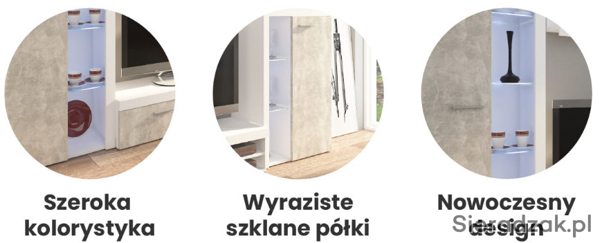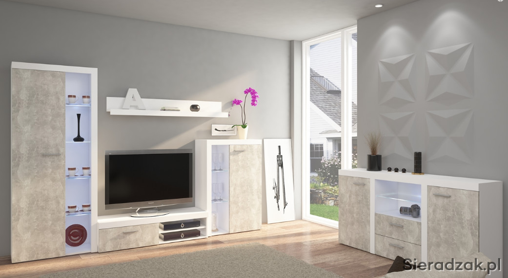 Meblościanka Rumba od STOLARZ-LEMPERT wzbogaci każdą przestrzeń życiową. Kompozycja jest ponadczasowa i została zaprojektowana w 5 wersjach kolorystycznych: dąb sonoma, biały, dąb lefkas, beton jasny + biały, old style + matera. Korpus mebli, półka ścienna i wszystkie elementy na frontach wyróżniają się naturalnym wyglądem. Meblościanka Rumba oferuje mnóstwo miejsca do przechowywania wszystkich rzeczy, które musisz pomieścić. Ponadto możesz postawić telewizor na stoliku RTV, a książki z łatwością pomieścisz na półce wiszącej. Kompozycja została wykonana z wysokiej jakości płyty laminowanej 15mm odpornej na zanieczyszczenia. Meblościanka posiada szklane półki, które opcjonalnie możesz podświetlić oświetleniem LED, stwarzając tym samym reprezentacyjne miejsce na pamiątki z wakacji, ulubione dekoracje lub kosztowności. W skład kolekcji Rumba wchodzi również Meblościanka RUMBA XL XL, która oferuje jeszcze więcej miejsca na Twoje ulubione przedmioty.