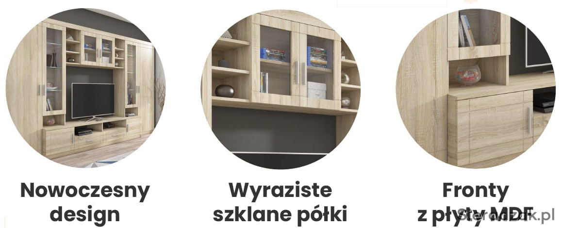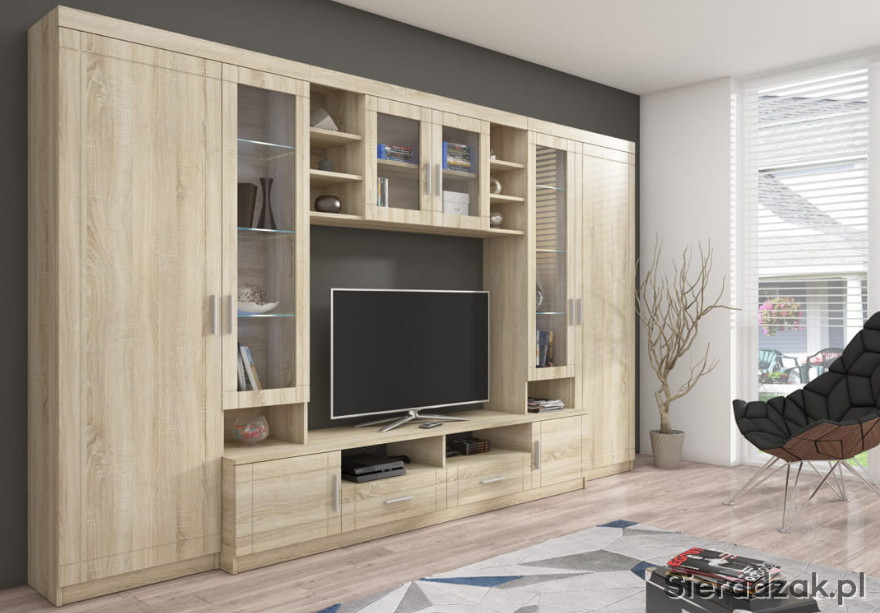 Meblościanka Paris to jednoczęściowy zestaw mebli do salonu, na który składa się kilka zintegrowanych elementów. Połączenie nowoczesnych mebli do salonu w kolorze dąb sonoma tworzy przyjazną i przytulną atmosferę w Twoim domu. Meble oferują zarówno cenną przestrzeń do przechowywania, jak i miejsce na prezentację ulubionych przedmiotów i ozdób. W zakres kompozycji wchodzi również opcjonalne oświetlenie LED, które podkreśli całą aranżację, stawiając Twoje ulubione przedmioty w centrum uwagi. Najwyższa jakość wykonania plasuje meblościankę Paris na pierwszym miejscu wśród najbardziej wszechstronnych mebli salonowych.