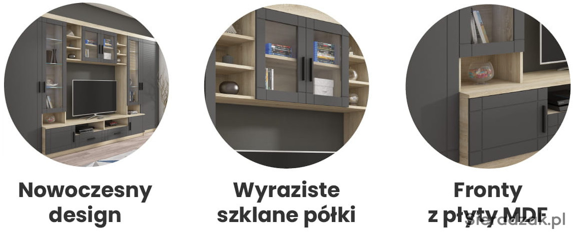 Meblościanka Paris to jednoczęściowy zestaw mebli do salonu, na który składa się kilka zintegrowanych elementów. Połączenie nowoczesnych mebli do salonu w kolorze dąb sonoma tworzy przyjazną i przytulną atmosferę w Twoim domu. Meble oferują zarówno cenną przestrzeń do przechowywania, jak i miejsce na prezentację ulubionych przedmiotów i ozdób. W zakres kompozycji wchodzi również opcjonalne oświetlenie LED, które podkreśli całą aranżację, stawiając Twoje ulubione przedmioty w centrum uwagi. Najwyższa jakość wykonania plasuje meblościankę Paris na pierwszym miejscu wśród najbardziej wszechstronnych mebli salonowych.