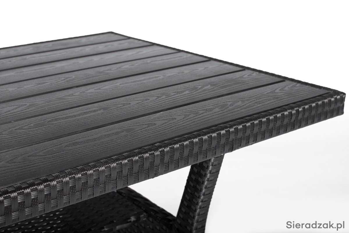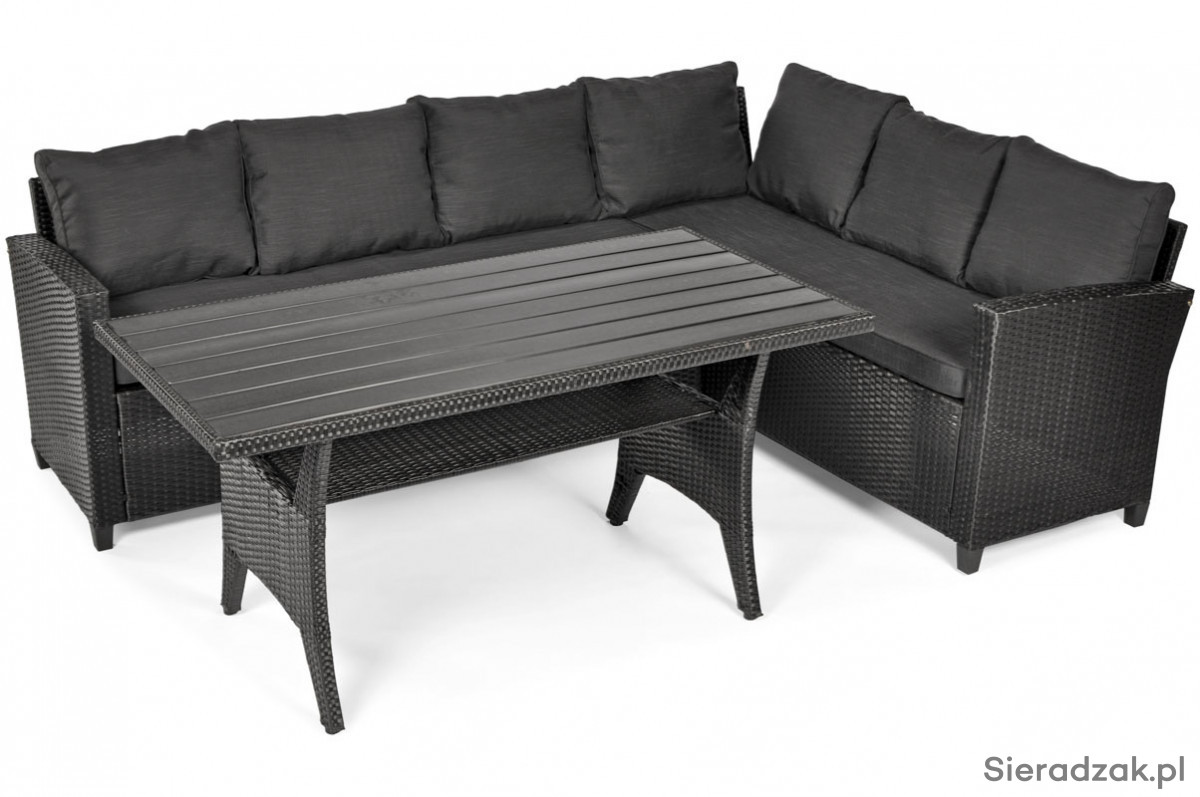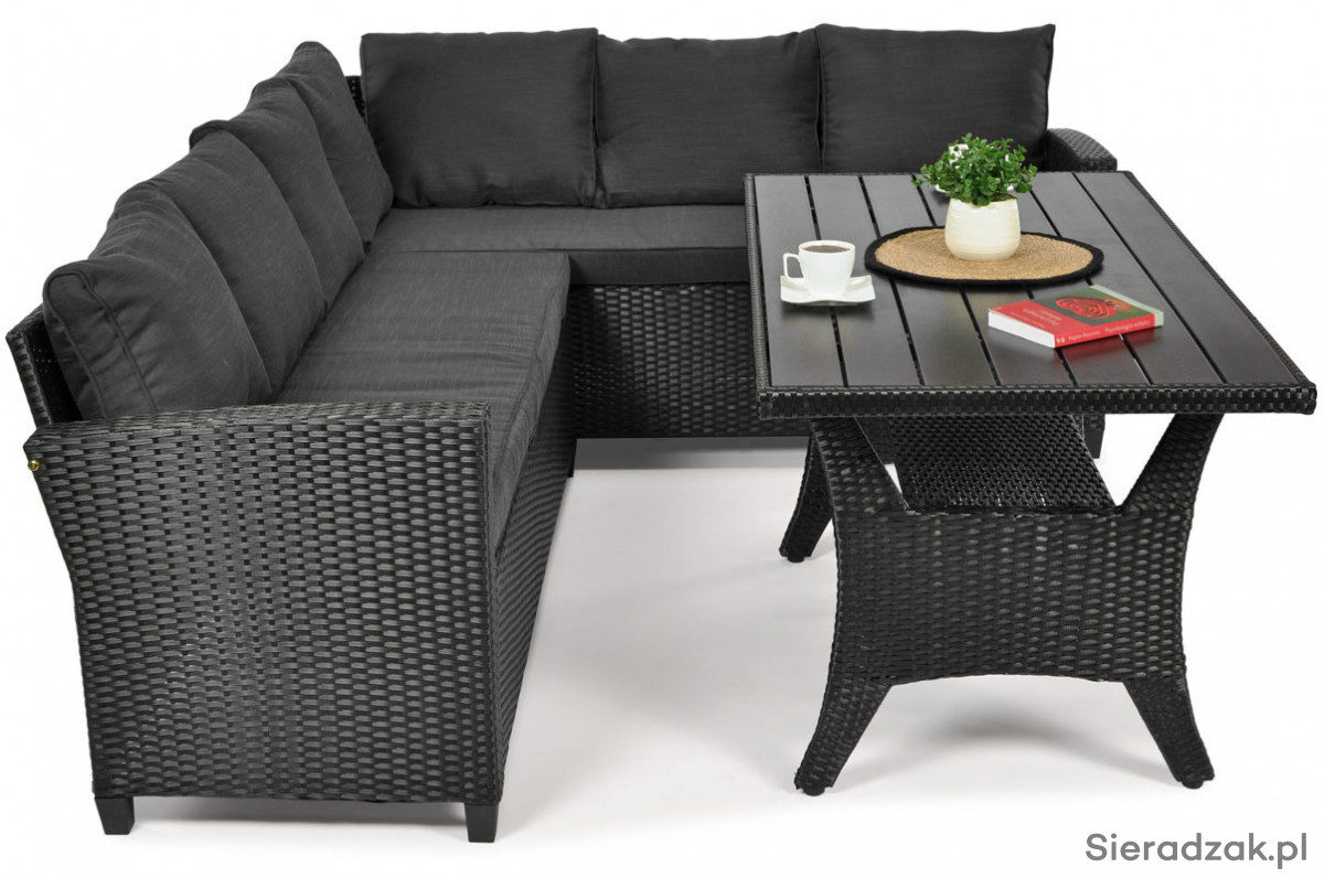 Duży narożnik ogrodowy z technorattanu w zestawie ze stołem 6 -osobowym i poduszkami. Uniwersalna sofa tarasowa narożna w kolorze czarnym. Wygodny komplet wypoczynkowy z narożną kanapą i lewo lub prawostronny.