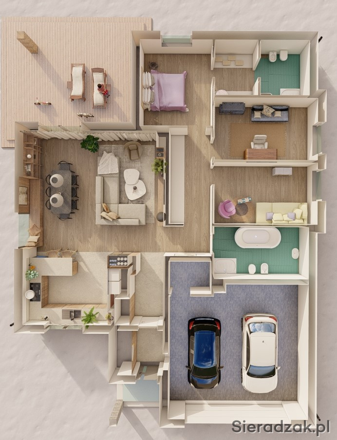 - taras to dodatkowa powierzchnia 23,5 m2 zadaszona i ocieplona, która w przyszłości może służyć jako ogród zimowy