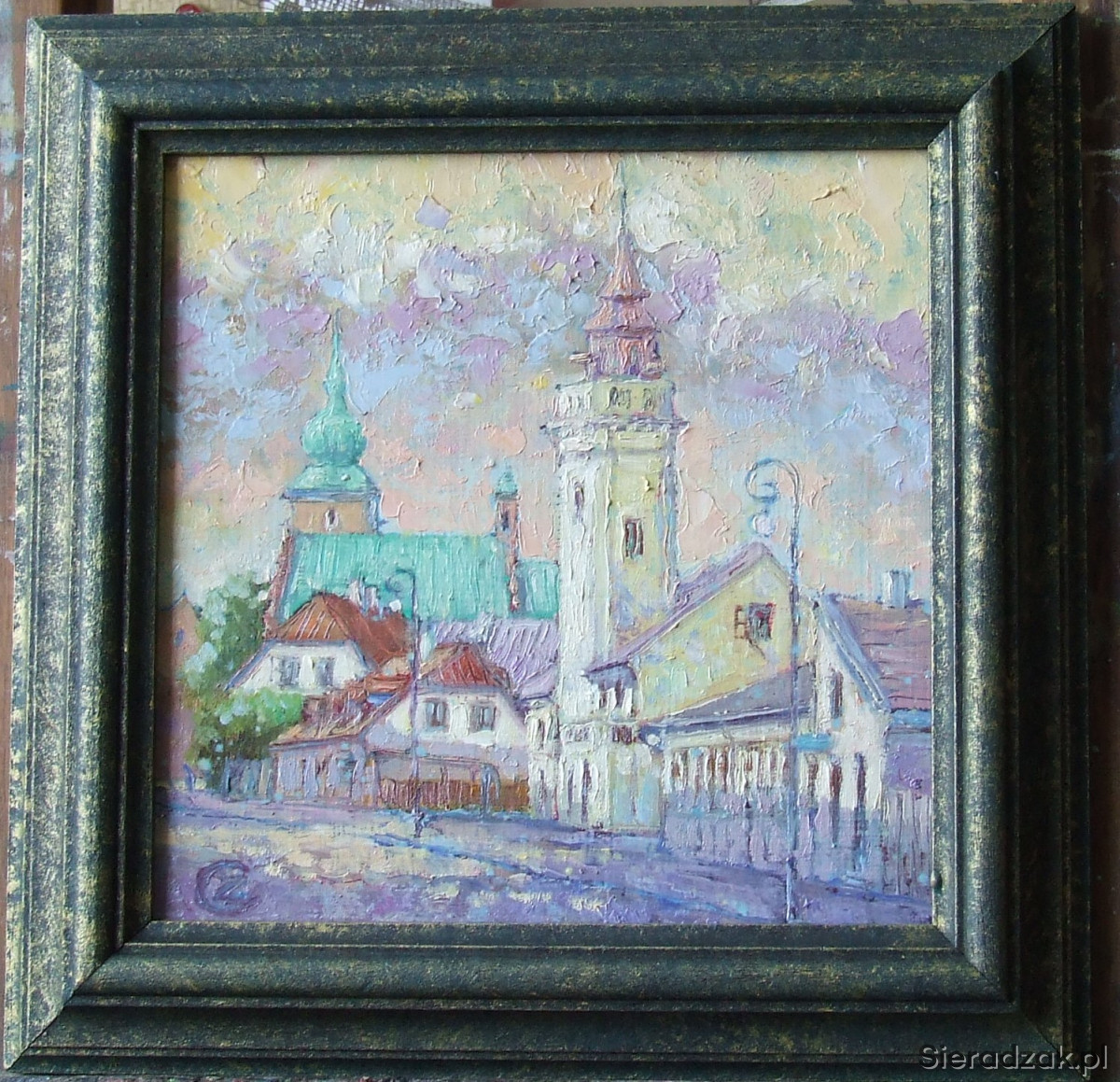 Obraz olejny na desce. Przedstawia charakterystyczny fragment ul.Krakowskie Przedmieścdie w Sieradzu, z budynkiem OSP oraz kolegiatą w tle. Obraz werniksowany, oprawiony w oryginalną, drewnianą ramę. Format obrazu -20x20cm.,a łącznie z oprawa- 28x28 cm. Autor- Cezary Zbrojewski. Stan jak na foto.