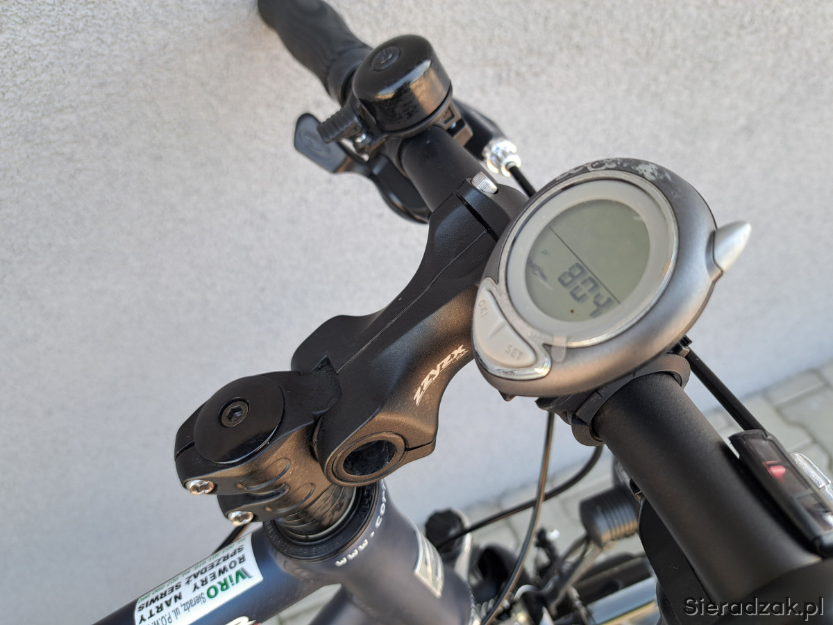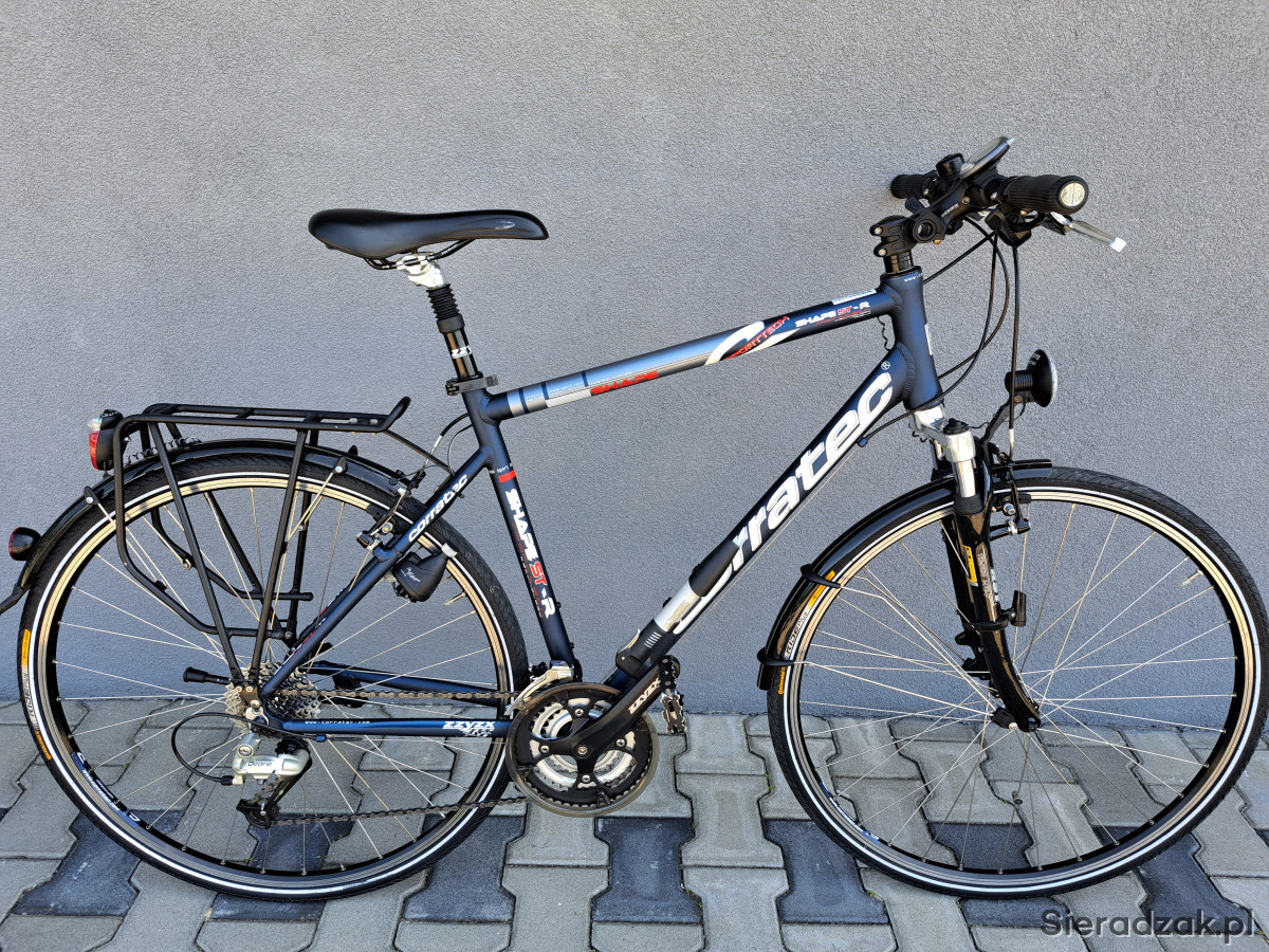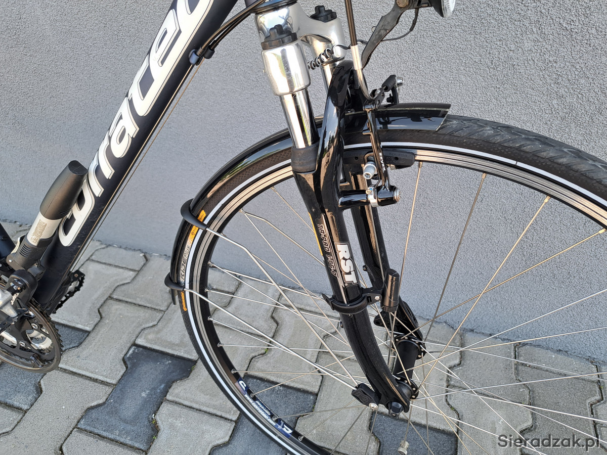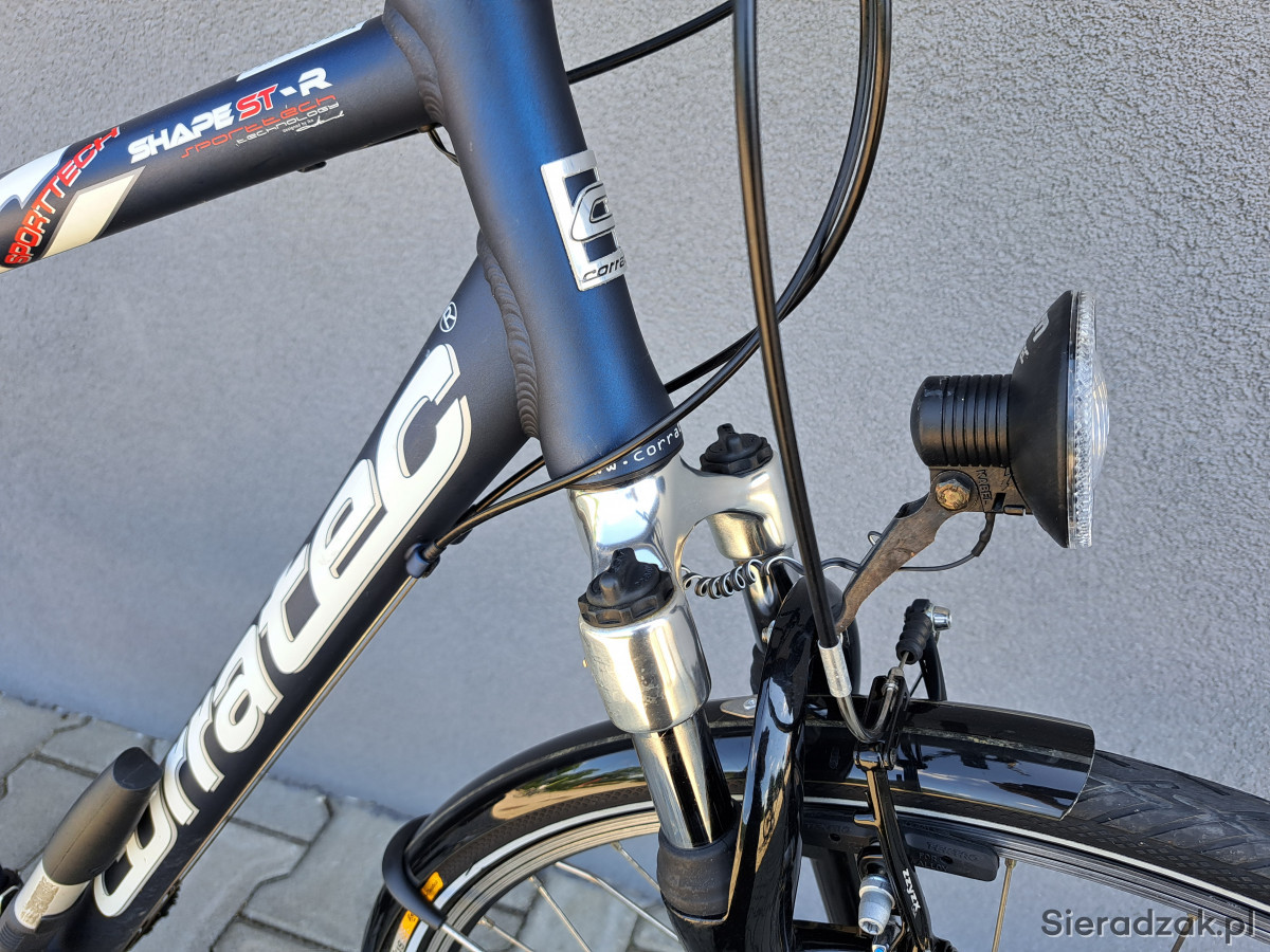 Rama aluminium 52cm,napęd 3x9,przerzutki shimano deore,manetki shimano deore,hamulce v-brake zzyzx,oświetlenie zasilane z dynama zewnętrznego,mostek kierownicy regulowany,sztyca podsiodłowa amortyzowana,obręcze corratec,opony continental ride plus,amortyzator rst.Ponadto rower wyposażony w wąski bagażnik,błotniki,stopkę,licznik,dzwonek,pompkę.