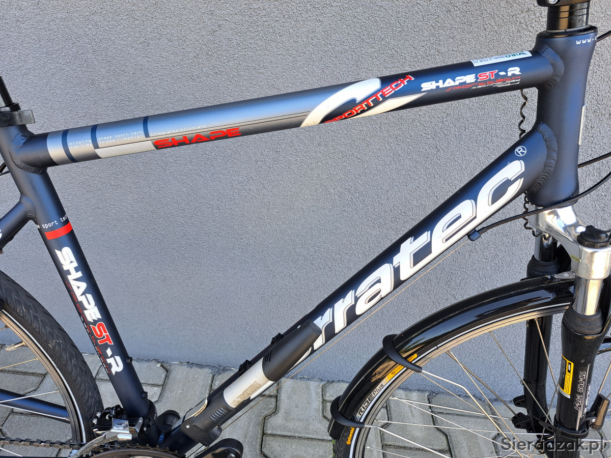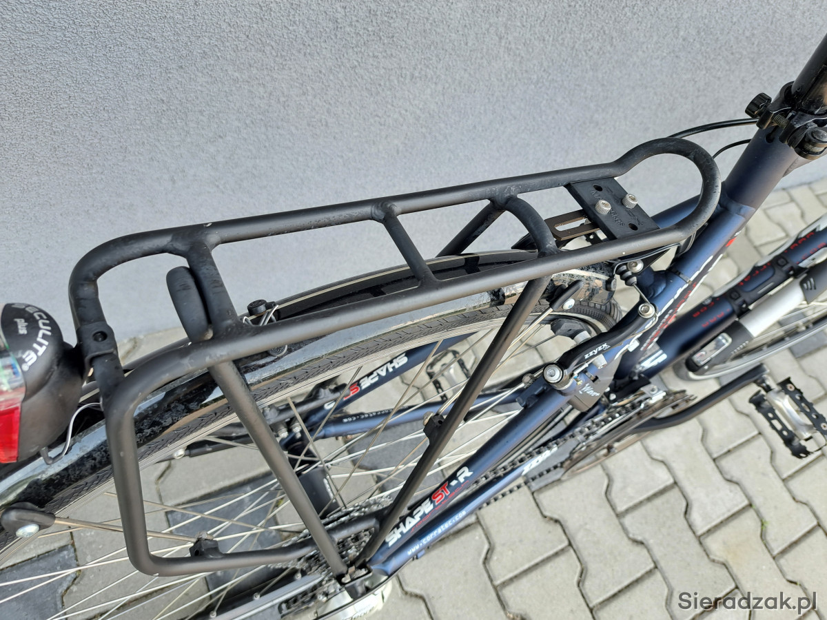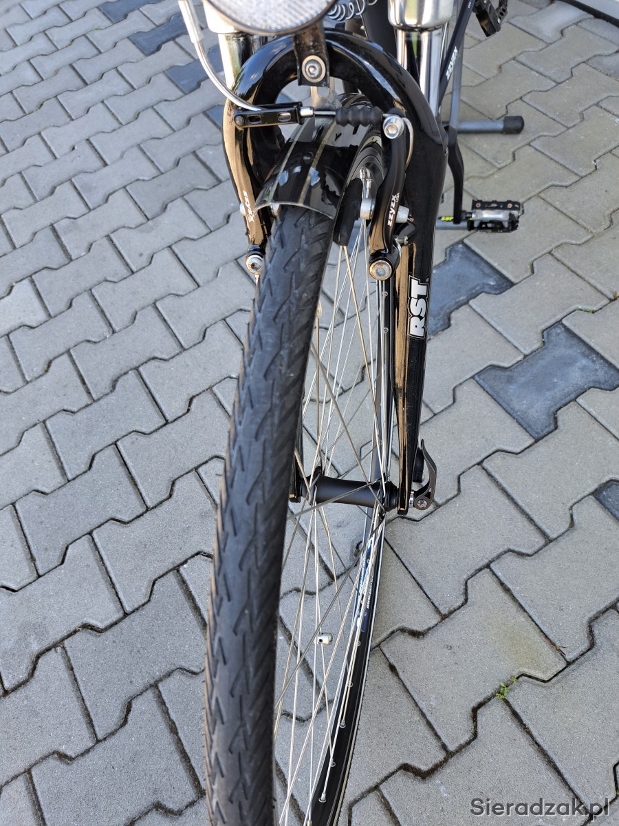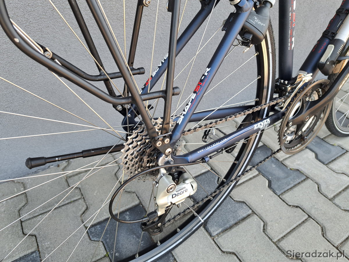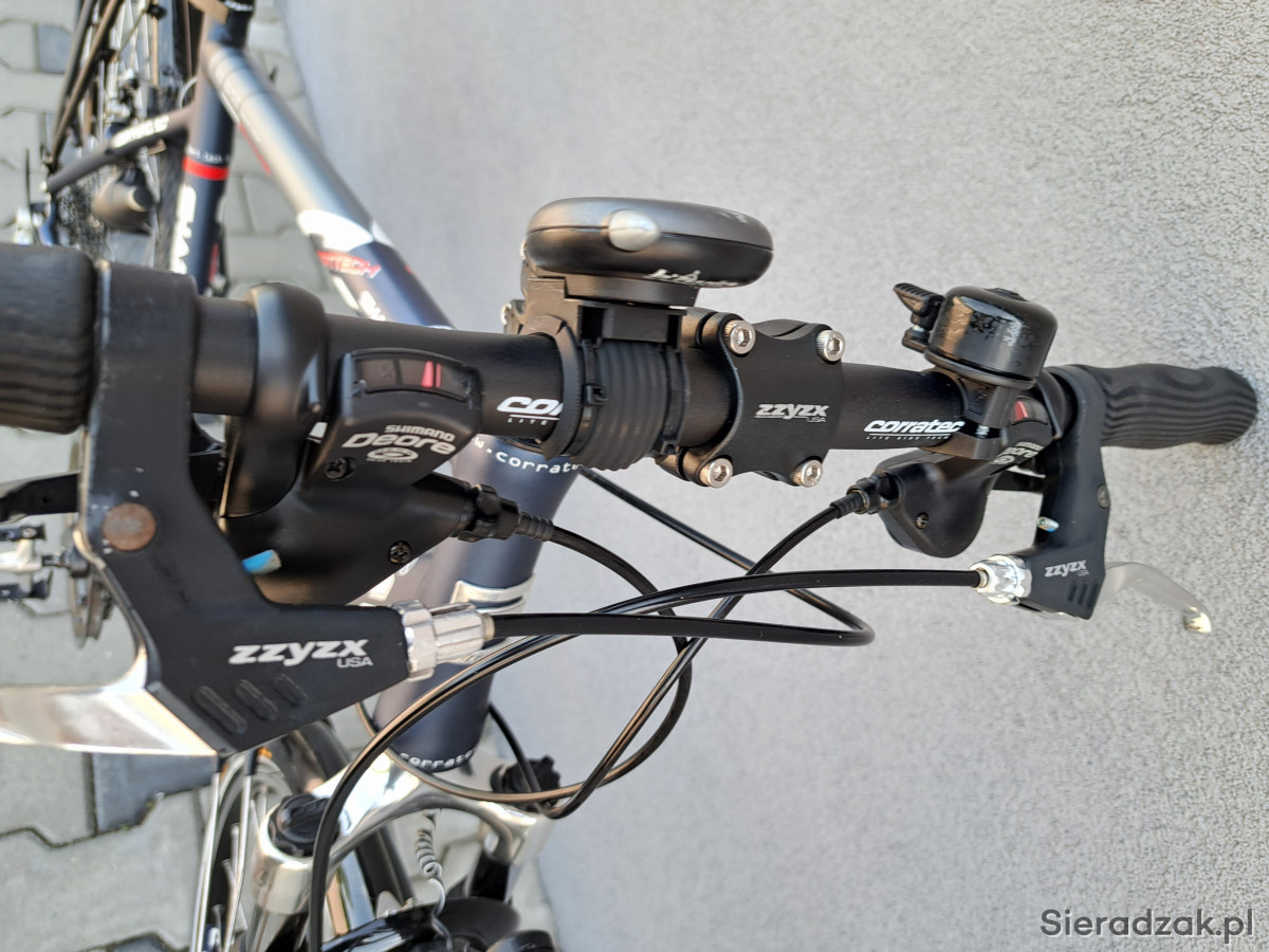 Rama aluminium 52cm,napęd 3x9,przerzutki shimano deore,manetki shimano deore,hamulce v-brake zzyzx,oświetlenie zasilane z dynama zewnętrznego,mostek kierownicy regulowany,sztyca podsiodłowa amortyzowana,obręcze corratec,opony continental ride plus,amortyzator rst.Ponadto rower wyposażony w wąski bagażnik,błotniki,stopkę,licznik,dzwonek,pompkę.
