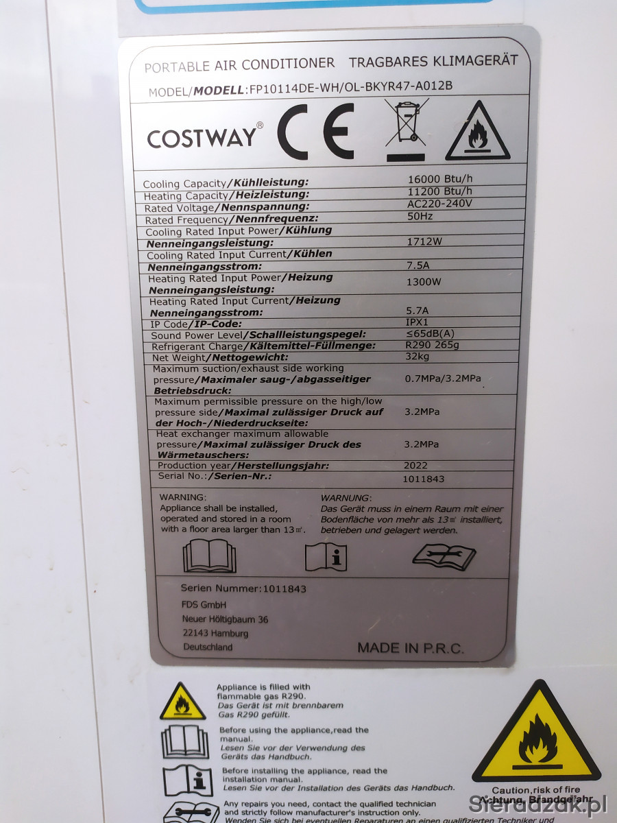 Sprzedam klimatyzator Costway FP10114DE-WH