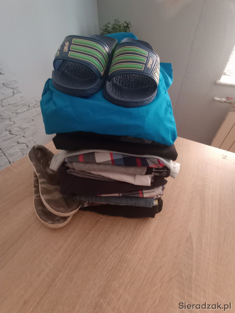 Paczka ubrań 134 rozmiar, kurtka, koszula biała, czarne spodnie, klapki, spodnie dresowe 3 pary, spodenki 2 pary, koszulki 3, koszule 2, piżama,buty, dżinsy razem 17 sztuk tel.791489919