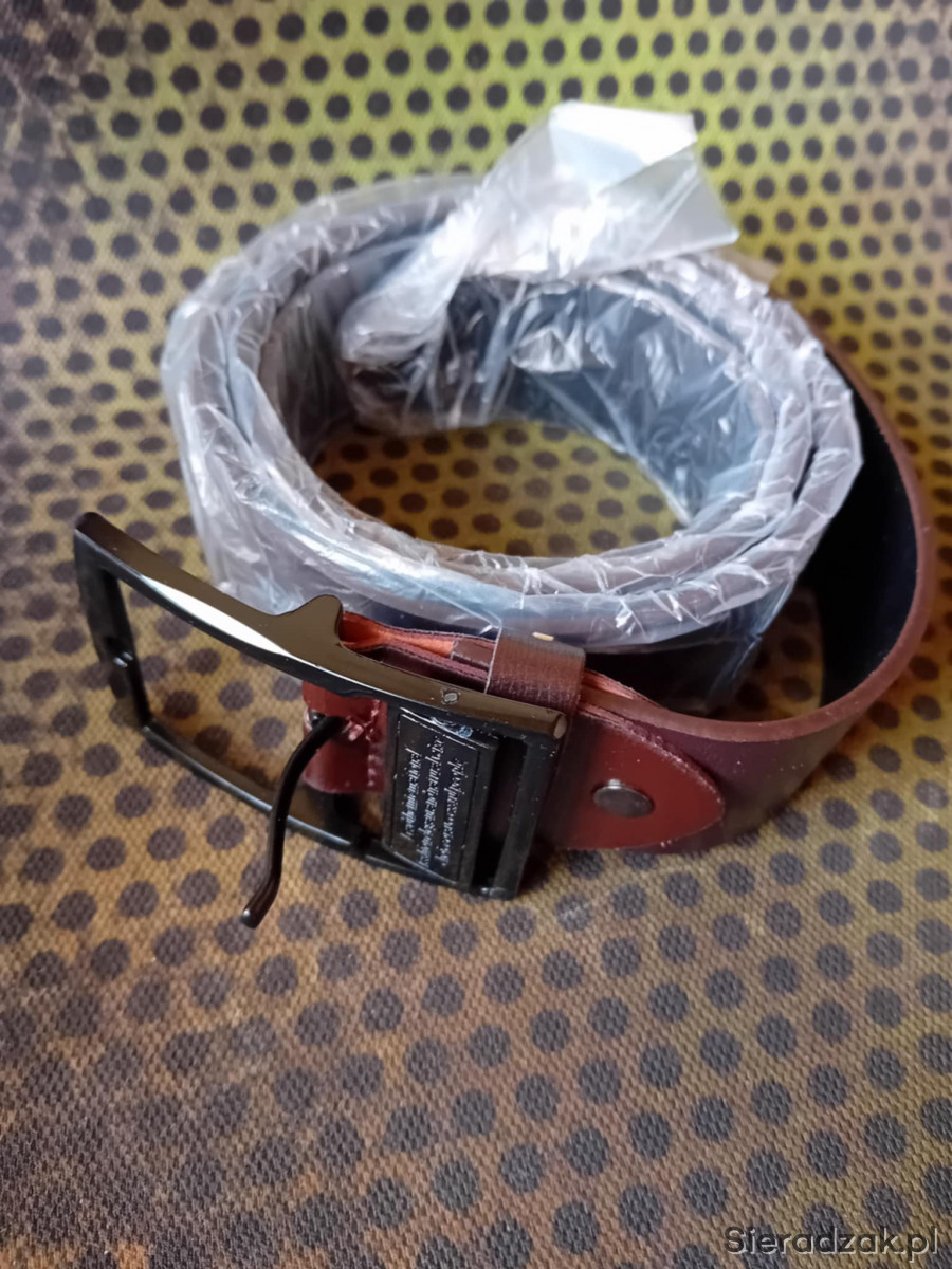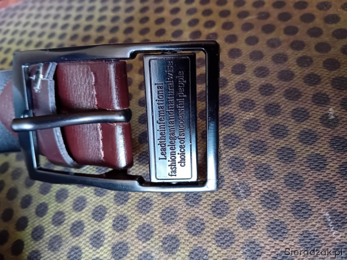 Nowy brązowy pasek z czarną klamrą ze sztucznej skóry. Długość paska około 120cm