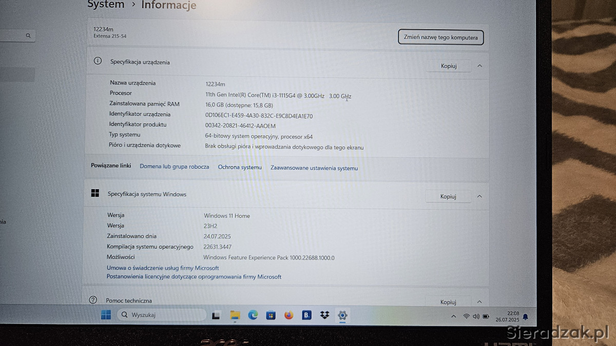 Na sprzedaż laptop, Acer Extensa 15, jest to świeży oraz szybki sprzęt ponieważ posiada procesor i3-11 generacji, 16GB Ram DDR4 oraz 256GB dysk SSD M2 Nvme.