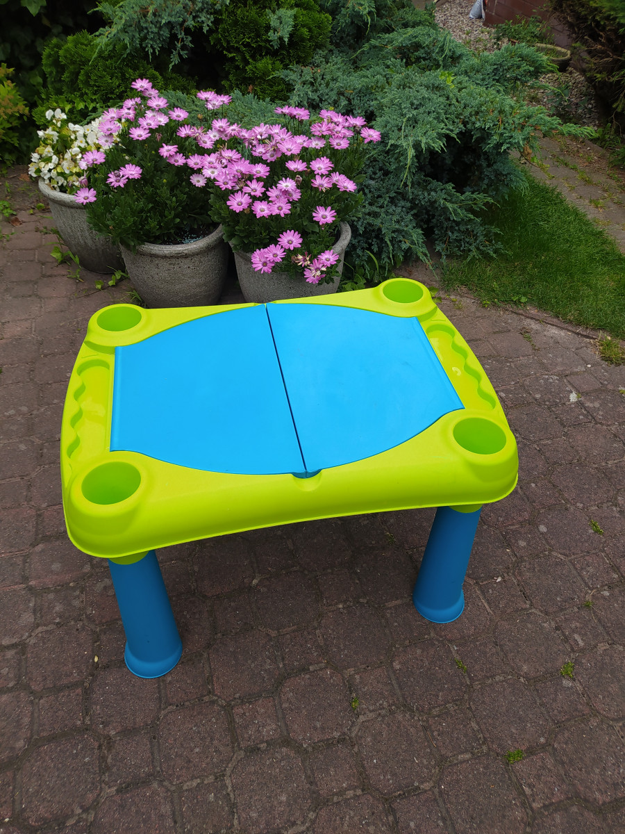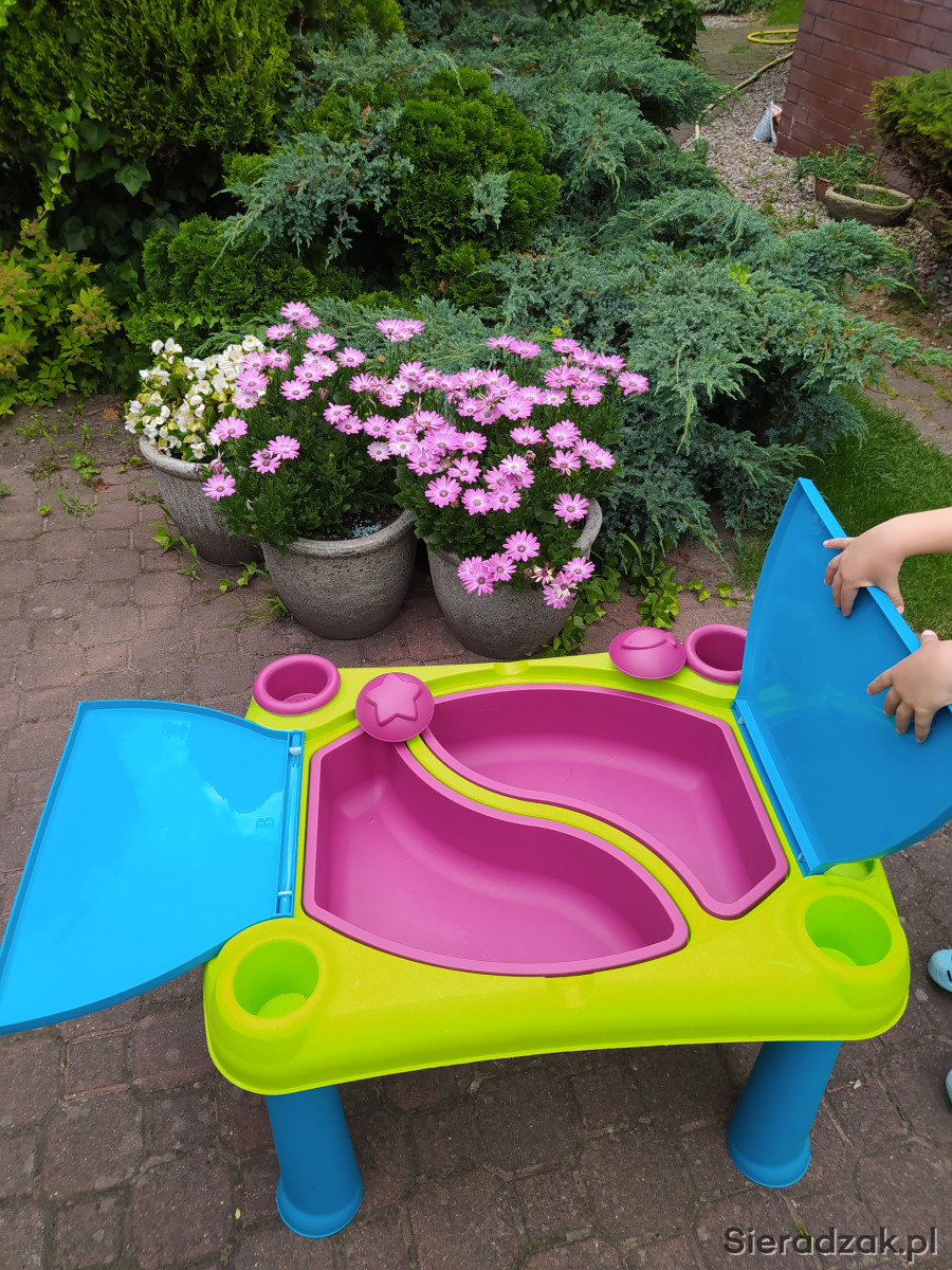 Fajny stolik/piaskownica do zabawy. U nas używany jedynie w domu do innych niż piaskownica zabaw. Polecam stan bdb.
