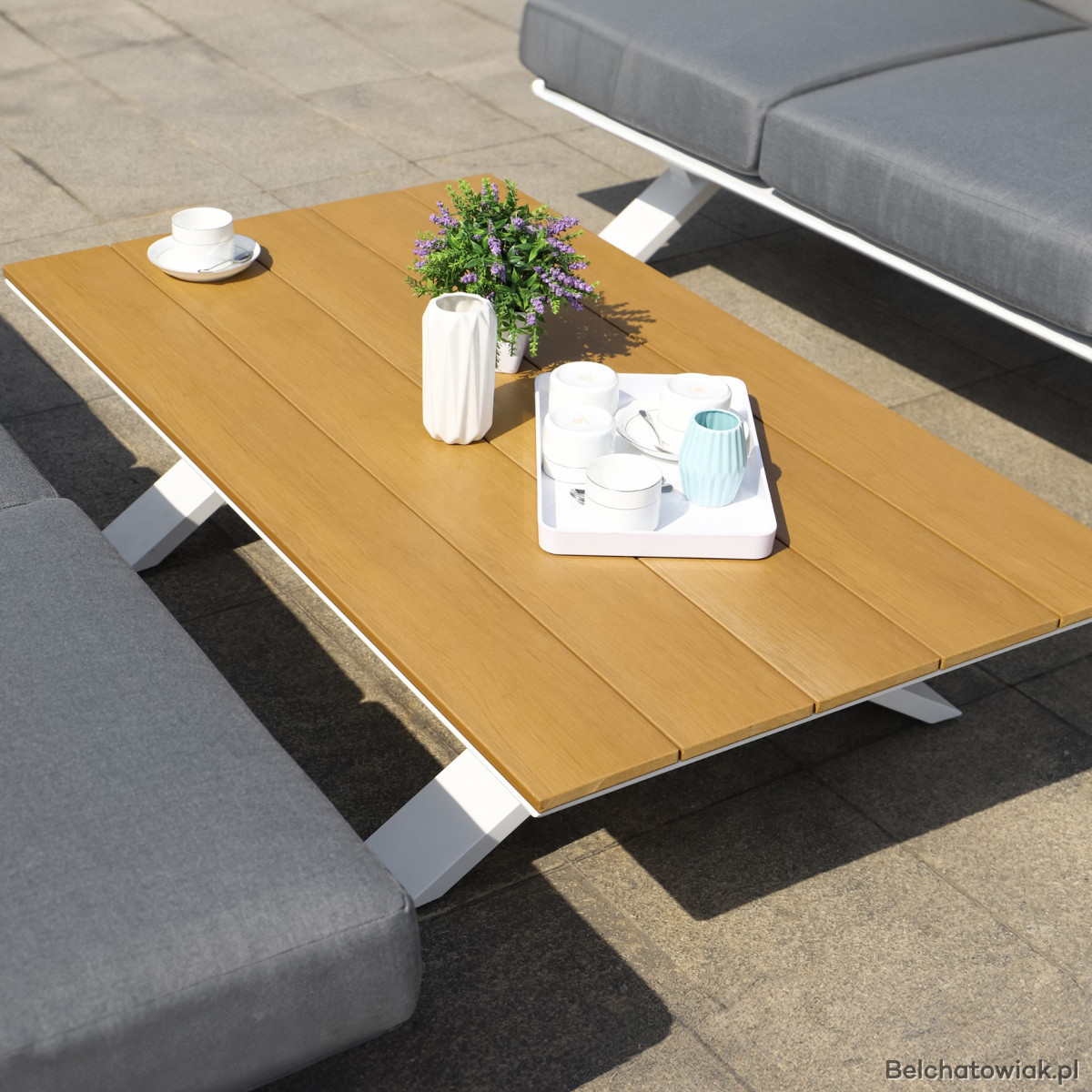 Meble wykonane są z trwałych materiałów odpornych na warunki atmosferyczne. Poszewki na poduszki można ściągać i prać, co ułatwia ich pielęgnację. Zestaw jest łatwy w czyszczeniu i stabilny, gwarantując komfort podczas siedzenia i leżenia.