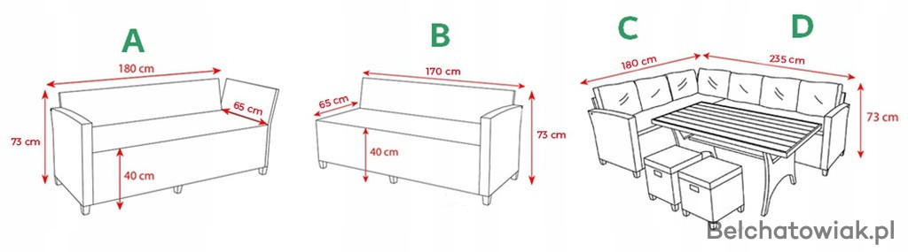 Zestaw wyposażony jest w grube, wygodne poduszki, a dwie praktyczne pufy uzupełniają całość, zapewniając komfort wypoczynku i dodatkowe miejsca do siedzenia.