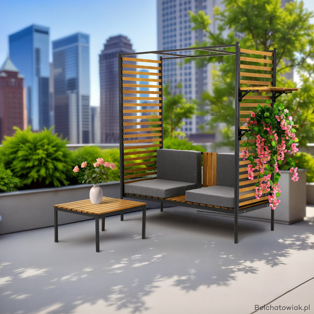 Zintegrowana ławka z wysokim oparciem zapewnia komfort siedzenia, a wkomponowane półki umożliwiają wyeksponowanie roślin, lampionów czy ulubionych dekoracji. To rozwiązanie, które łączy estetykę z praktycznością.