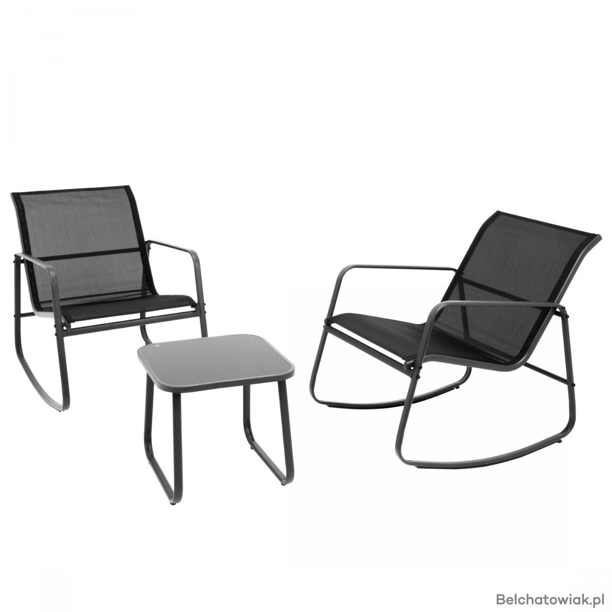 Zestaw mebli ogrodowych 57860 to stylowe i praktyczne rozwiązanie dla wszystkich, którzy chcą stworzyć wygodną strefę wypoczynku na tarasie, balkonie, patio czy w ogrodzie. Komplet składa się z dwóch bujanych foteli wykonanych z trwałej siatki textilene oraz eleganckiego stolika z blatem ze szkła hartowanego.