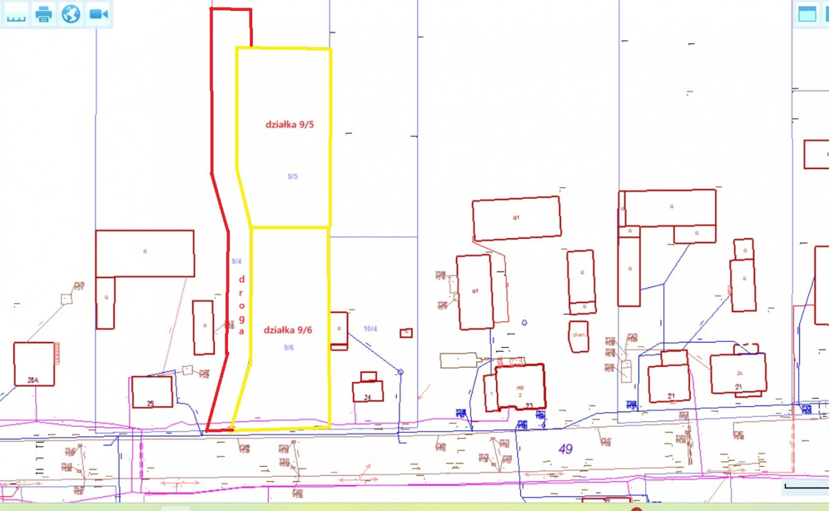 Szerokość działki od drogi to ok.25 metrów, kształt prostokąt.